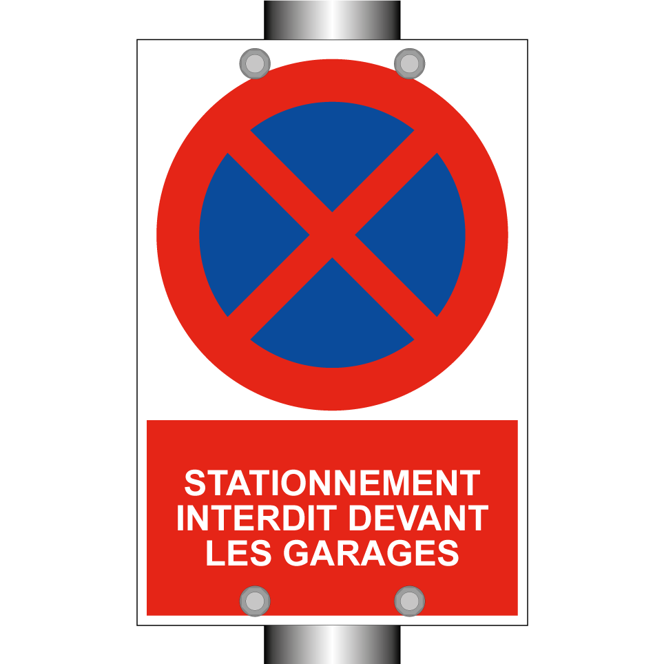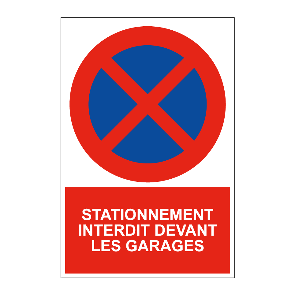 Panneau d'interdiction de stationner avec le texte : "Stationnement interdit devant les garages" et une symbolique claire.