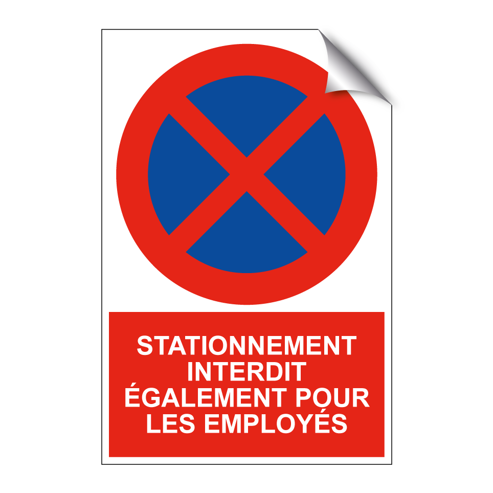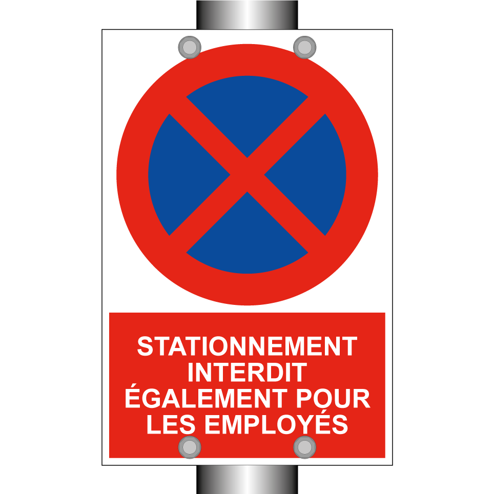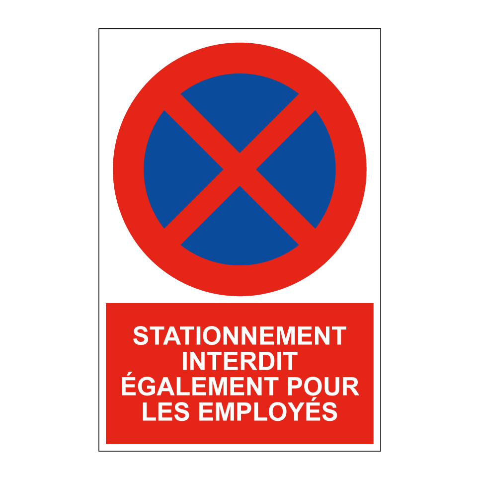 Panneau d'interdiction de stationner avec le texte : "Stationnement interdit également pour les employés" et une symbolique claire.