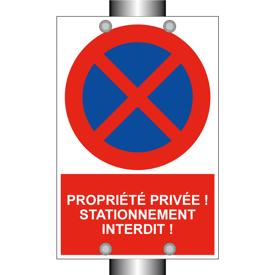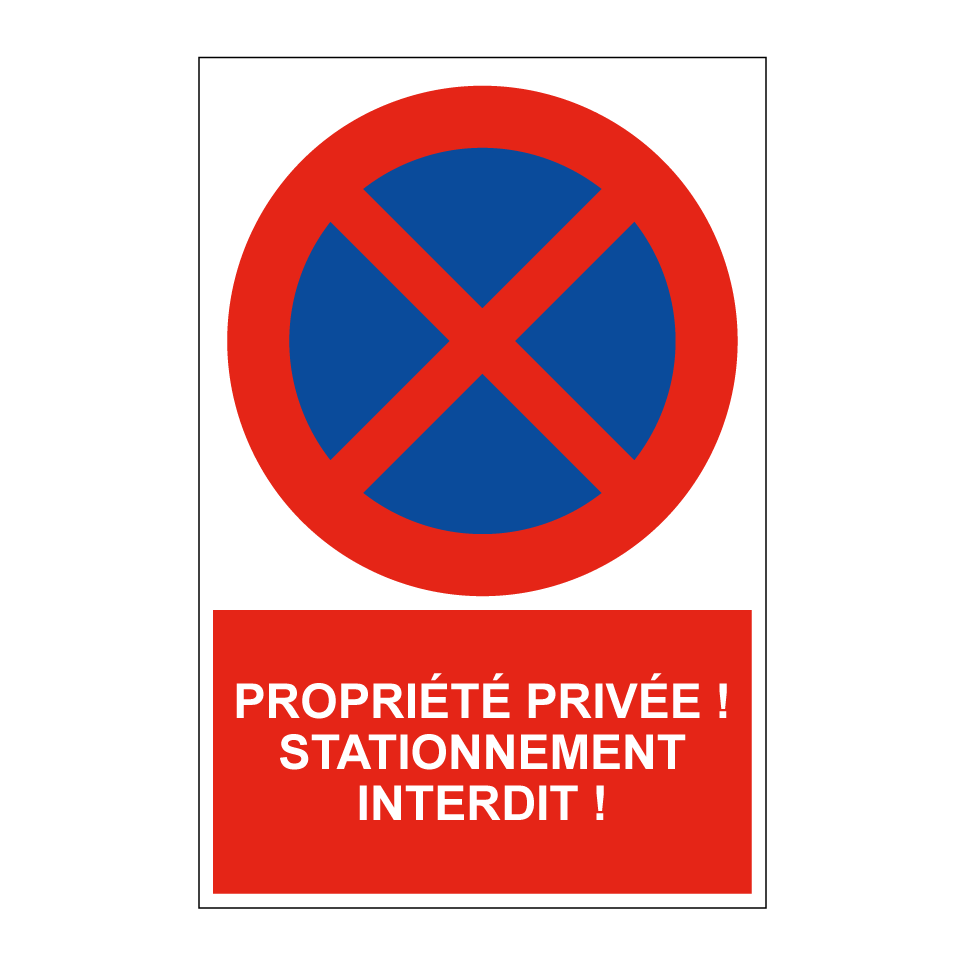 Panneau d'interdiction de stationner avec le texte : "Propriété privée ! Stationnement interdit !" et une symbolique claire.