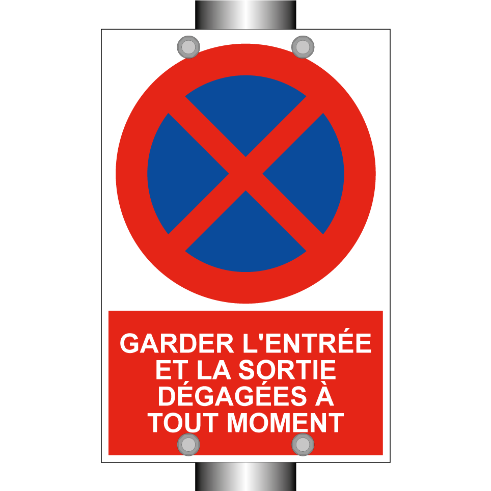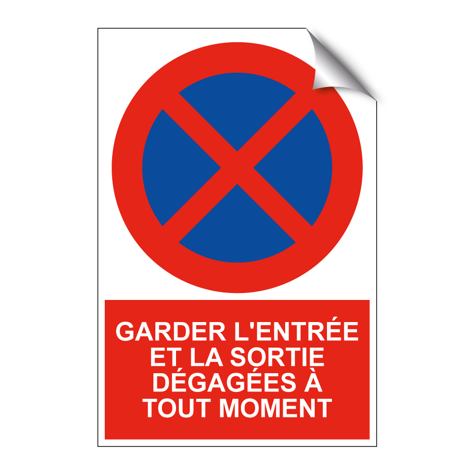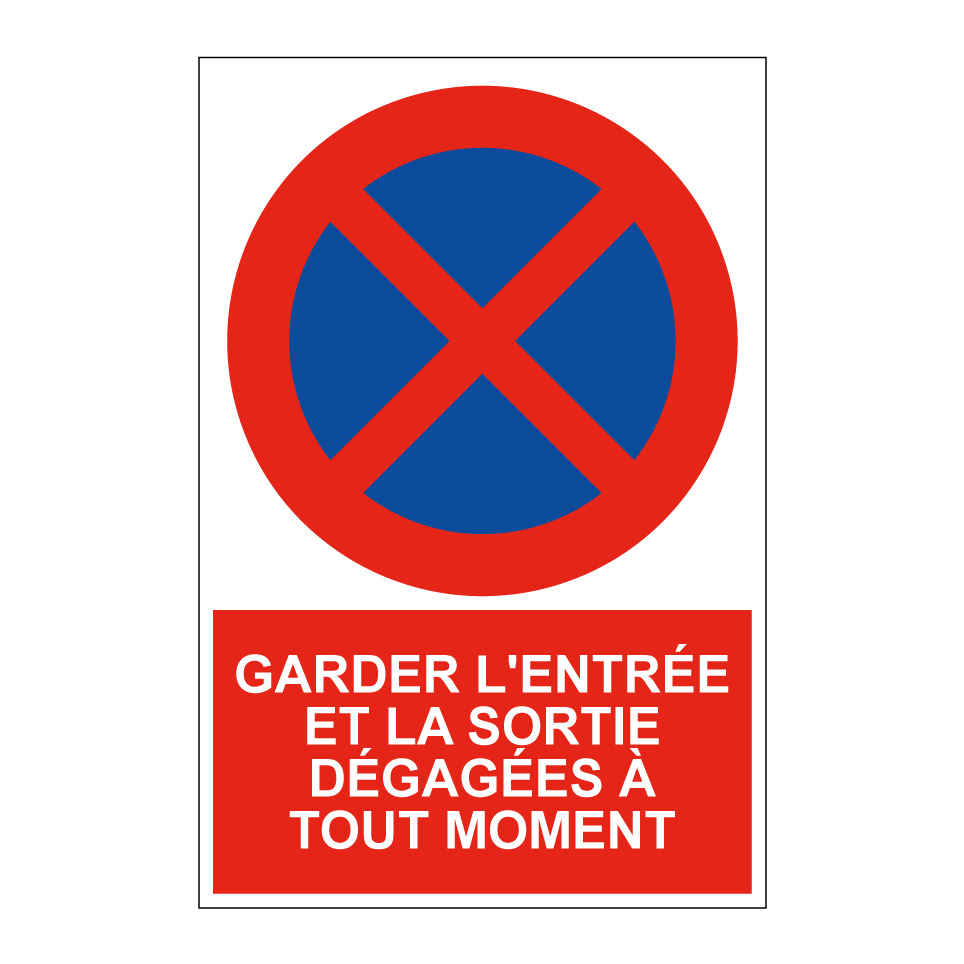 Panneau d'interdiction de stationner avec le texte : "Garder l'entrée et la sortie dégagées à tout moment" et une symbolique claire.