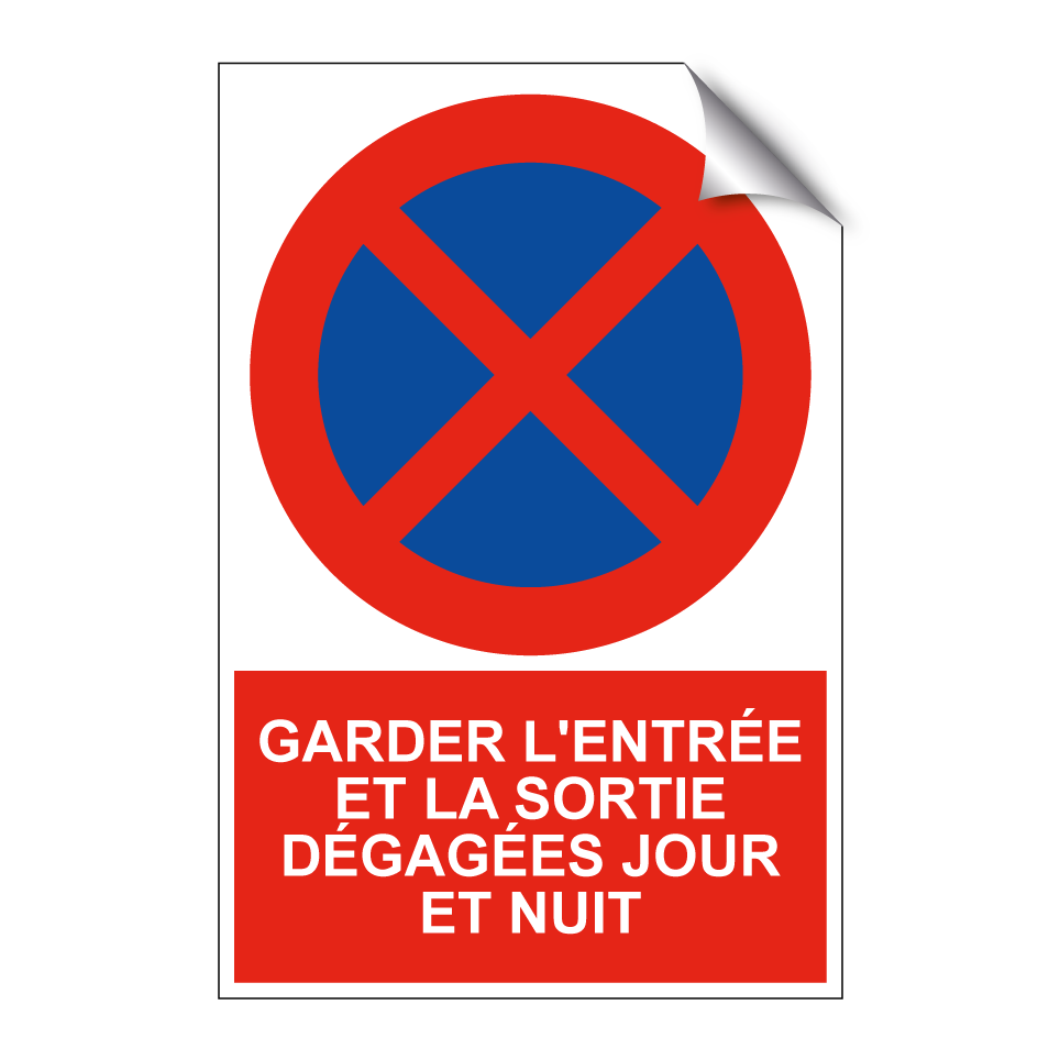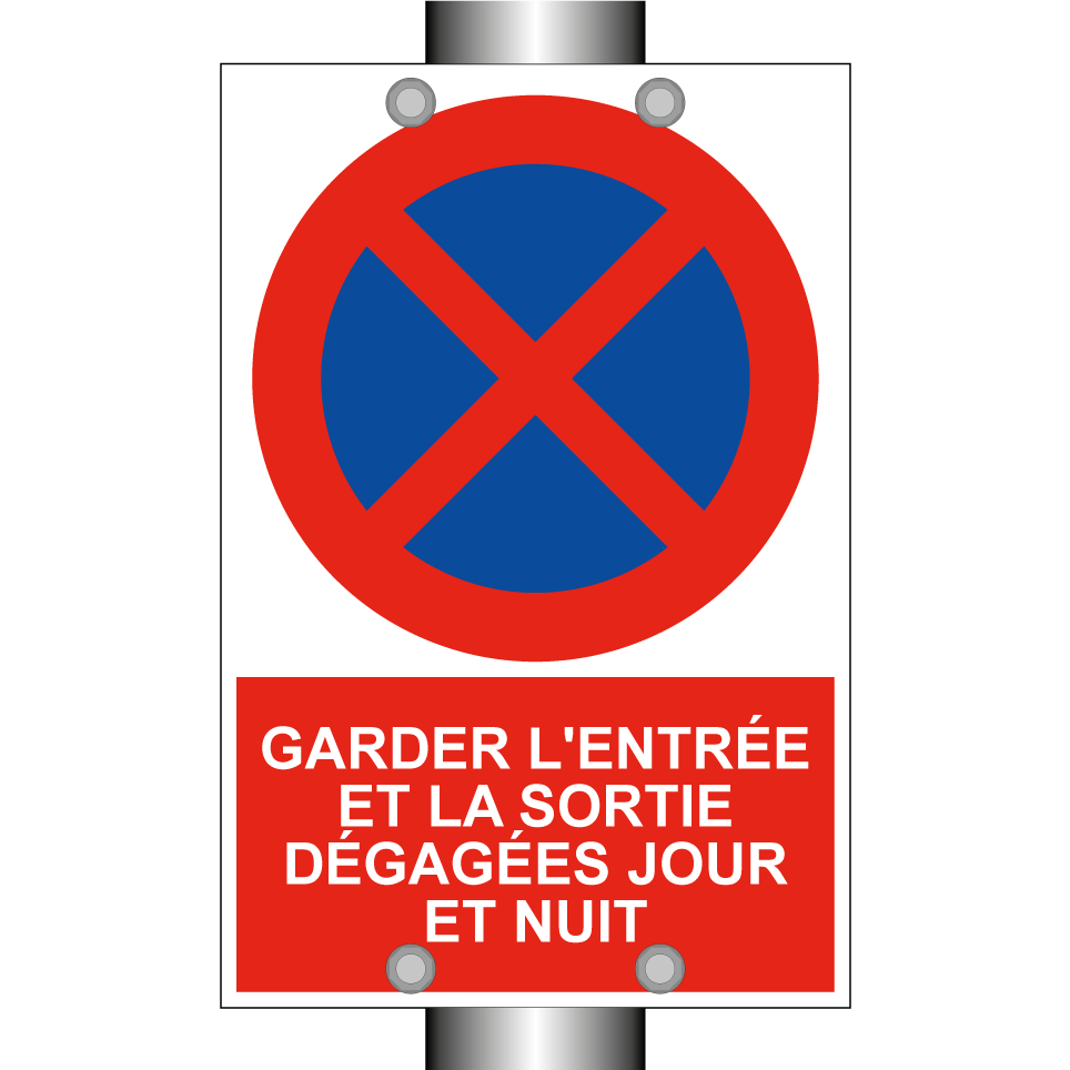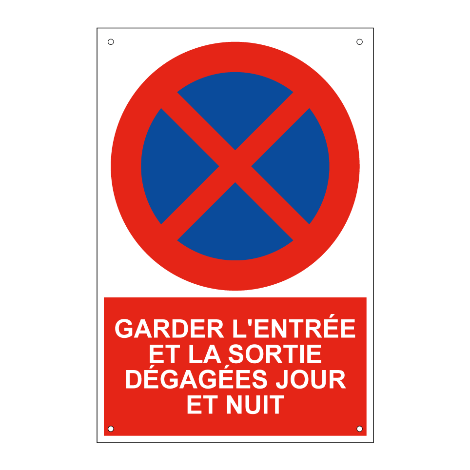 Panneau d'interdiction de stationner avec le texte : "Garder l'entrée et la sortie dégagées jour et nuit" et une symbolique claire.