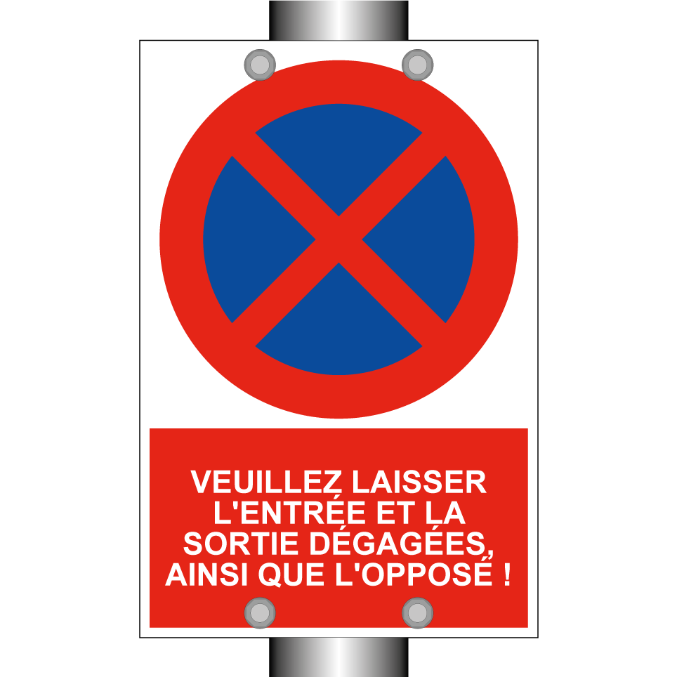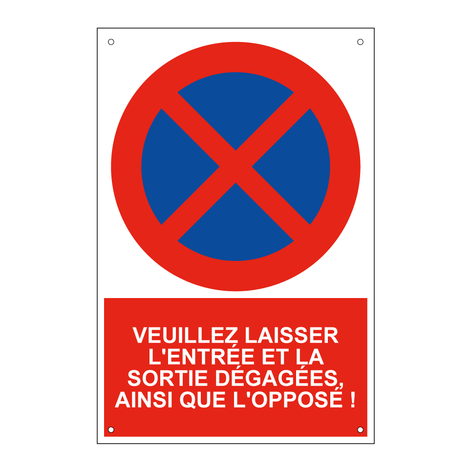 Panneau d'interdiction de stationner avec le texte : "Veuillez laisser l'entrée et la sortie dégagées, ainsi que l'opposé !" et une symbolique claire.