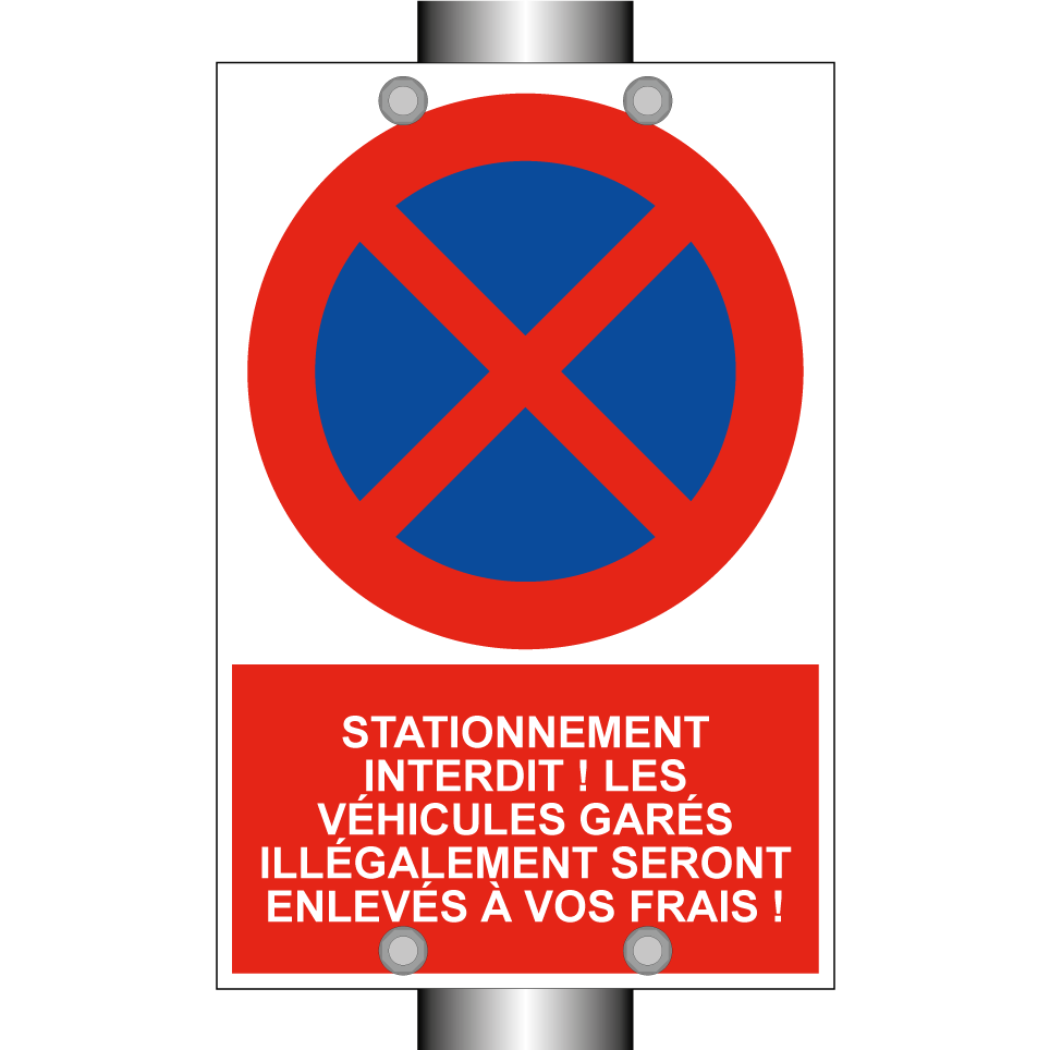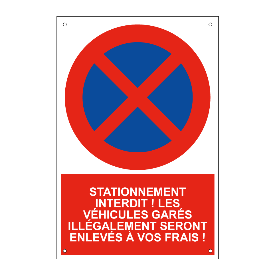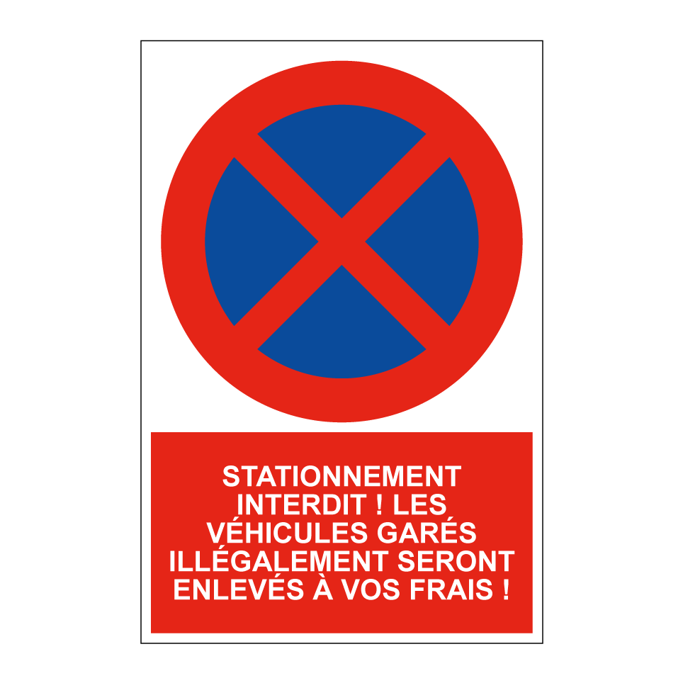Panneau d'interdiction de stationner avec le texte : "Stationnement interdit ! Les véhicules garés illégalement seront enlevés à vos frais !" et une symbolique claire.
