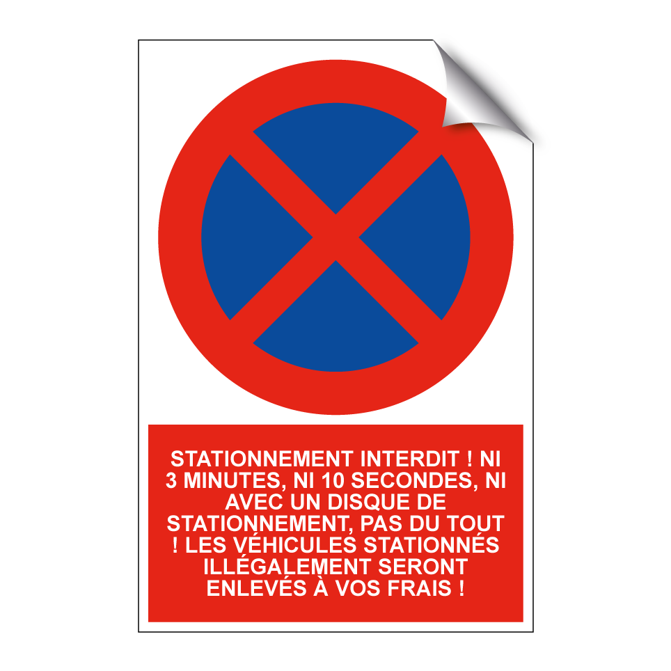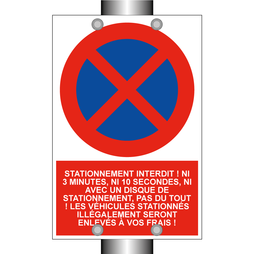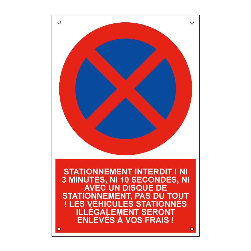 Panneau d'interdiction de stationner avec le texte : "Stationnement interdit ! Ni 3 minutes, ni 10 secondes, ni avec un disque de stationnement, pas du tout ! Les véhicules stationnés illégalement seront enlevés à vos frais !" et une symbolique claire.