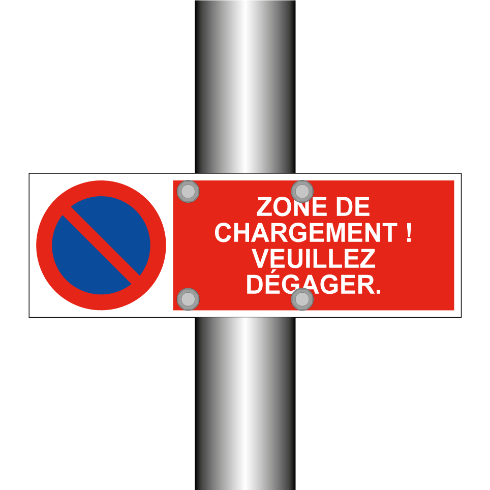 Panneau d'interdiction de stationner avec le texte : "Zone de chargement ! Veuillez dégager." et une symbolique claire.