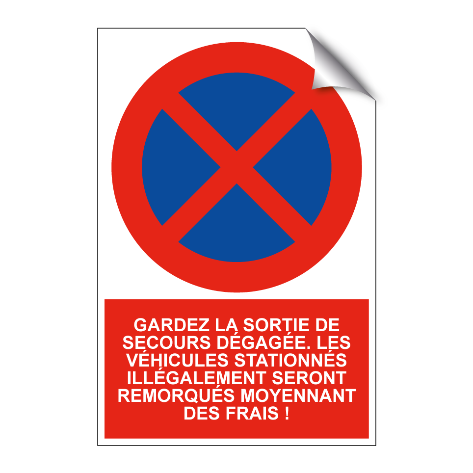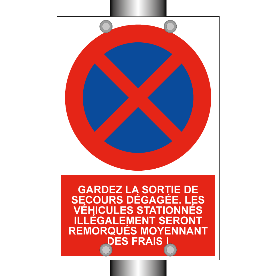 Panneau d'interdiction de stationner avec le texte : "Gardez la sortie de secours dégagée. Les véhicules stationnés illégalement seront remorqués moyennant des frais !" et une symbolique claire.