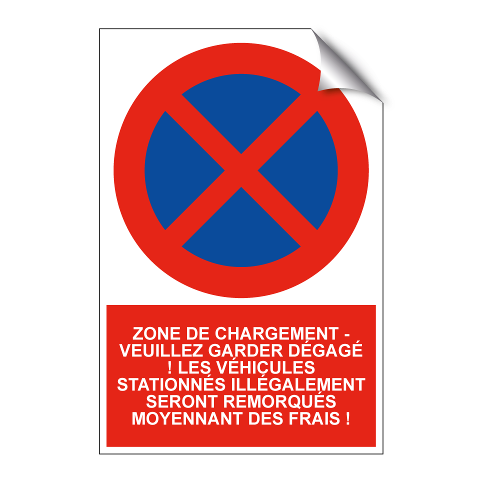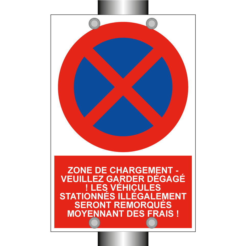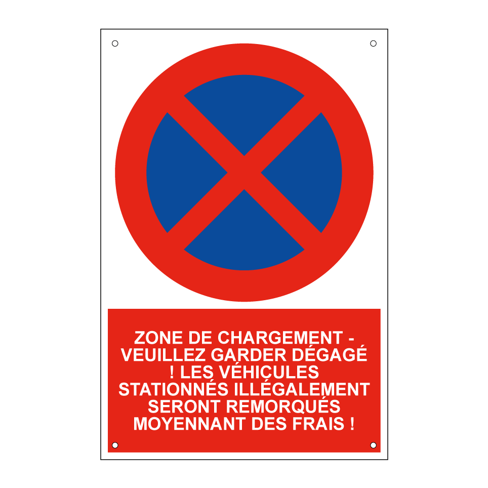 Panneau d'interdiction de stationner avec le texte : "Zone de chargement - veuillez garder dégagé ! Les véhicules stationnés illégalement seront remorqués moyennant des frais !" et une symbolique claire.