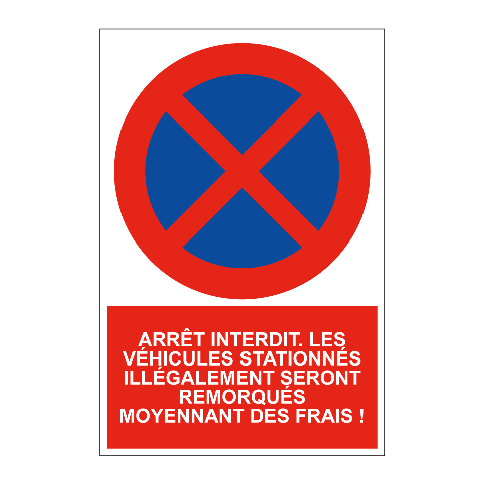 Panneau d'interdiction de stationner avec le texte : "Arrêt interdit. Les véhicules stationnés illégalement seront remorqués moyennant des frais !" et une symbolique claire.
