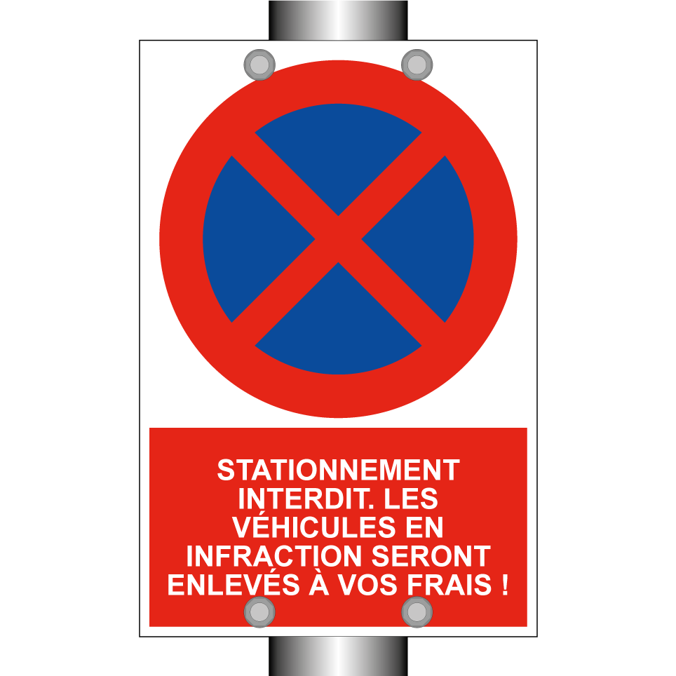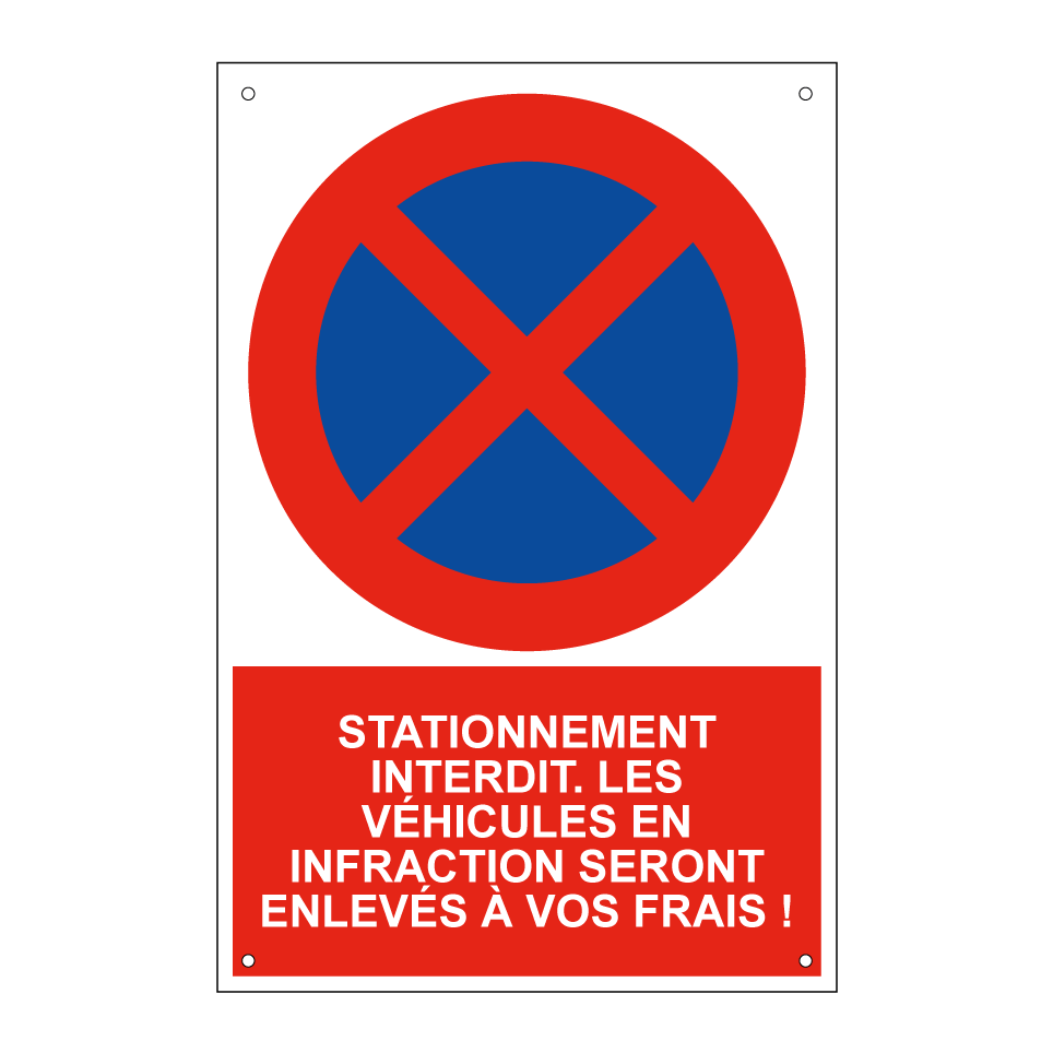 Panneau d'interdiction de stationner avec le texte : "Stationnement interdit. Les véhicules en infraction seront enlevés à vos frais !" et une symbolique claire.