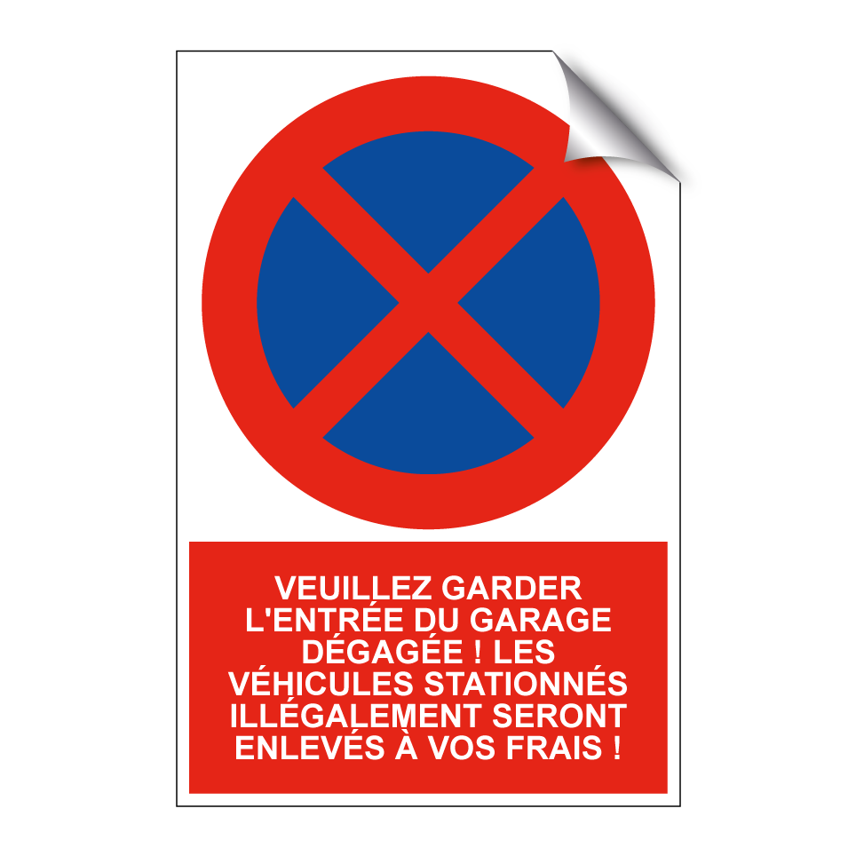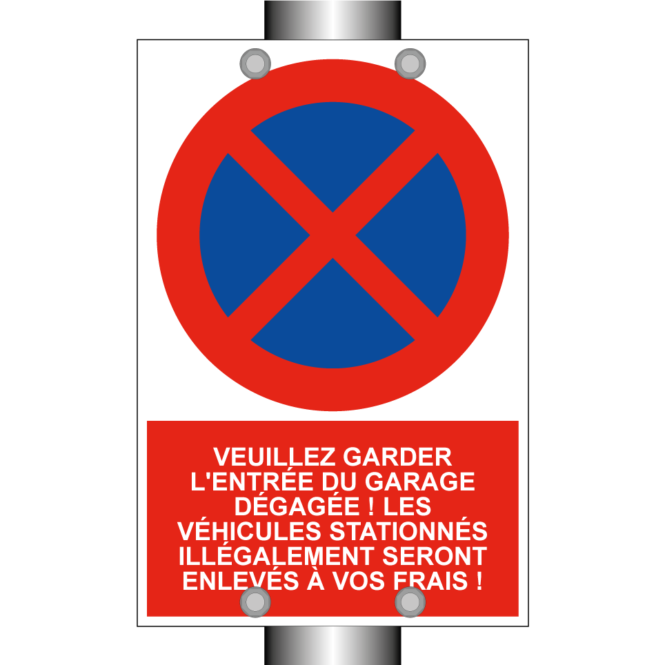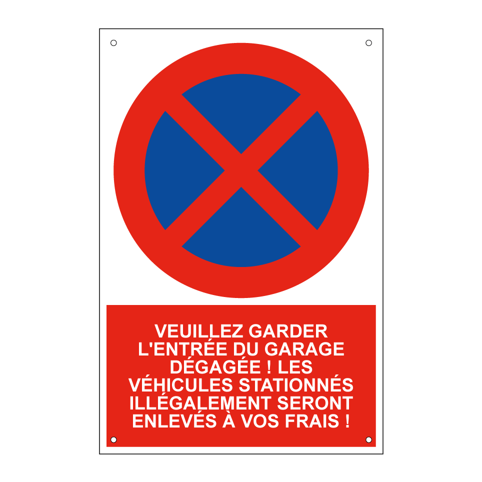Panneau d'interdiction de stationner avec le texte : "Veuillez garder l'entrée du garage dégagée ! Les véhicules stationnés illégalement seront enlevés à vos frais !" et une symbolique claire.