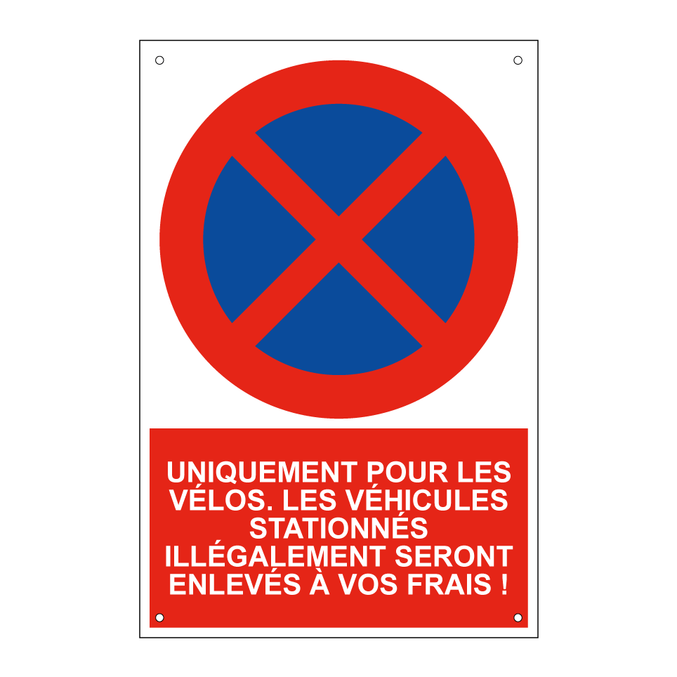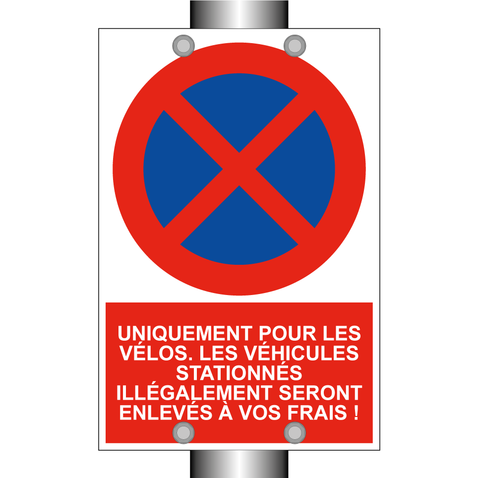 Panneau d'interdiction de stationner avec le texte : "Uniquement pour les vélos. Les véhicules stationnés illégalement seront enlevés à vos frais !" et une symbolique claire.