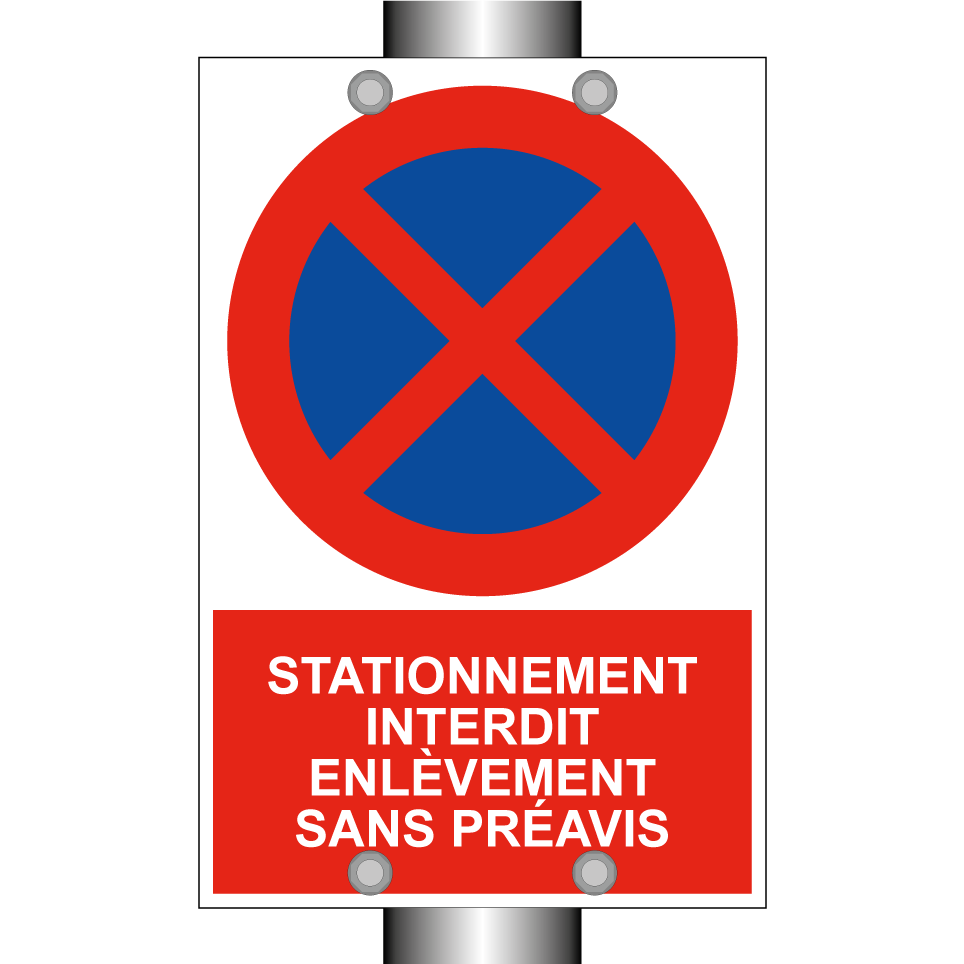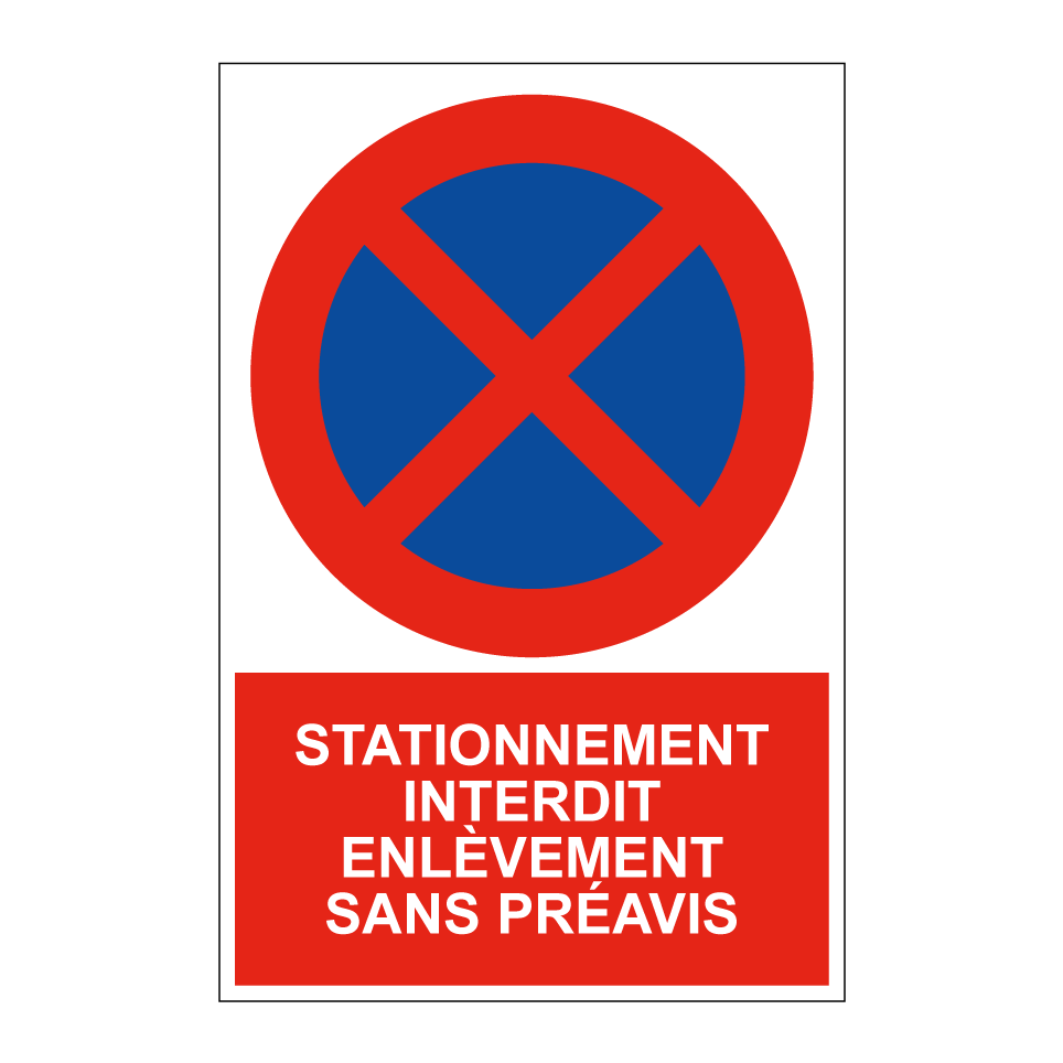 Panneau d'interdiction de stationner avec le texte : "Stationnement interdit enlèvement sans préavis" et une symbolique claire.