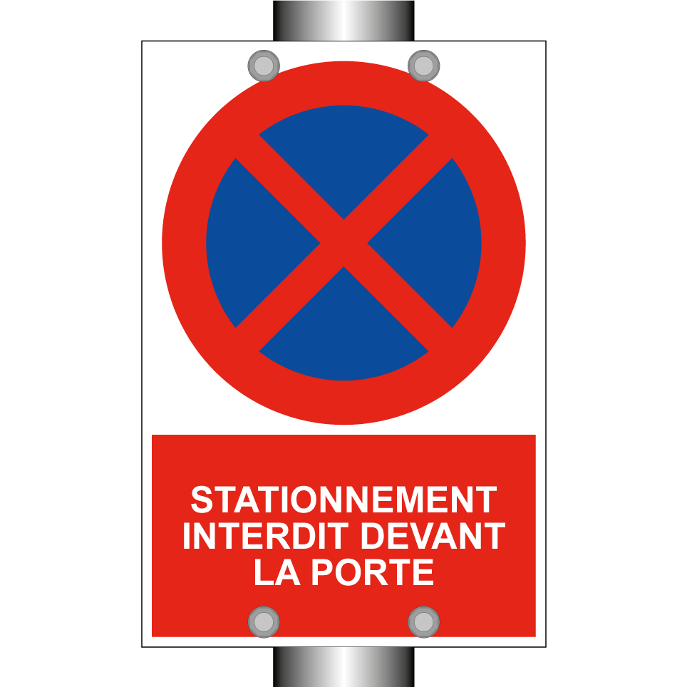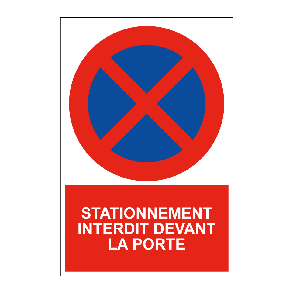 Panneau d'interdiction de stationner avec le texte : "Stationnement interdit devant la porte" et une symbolique claire.