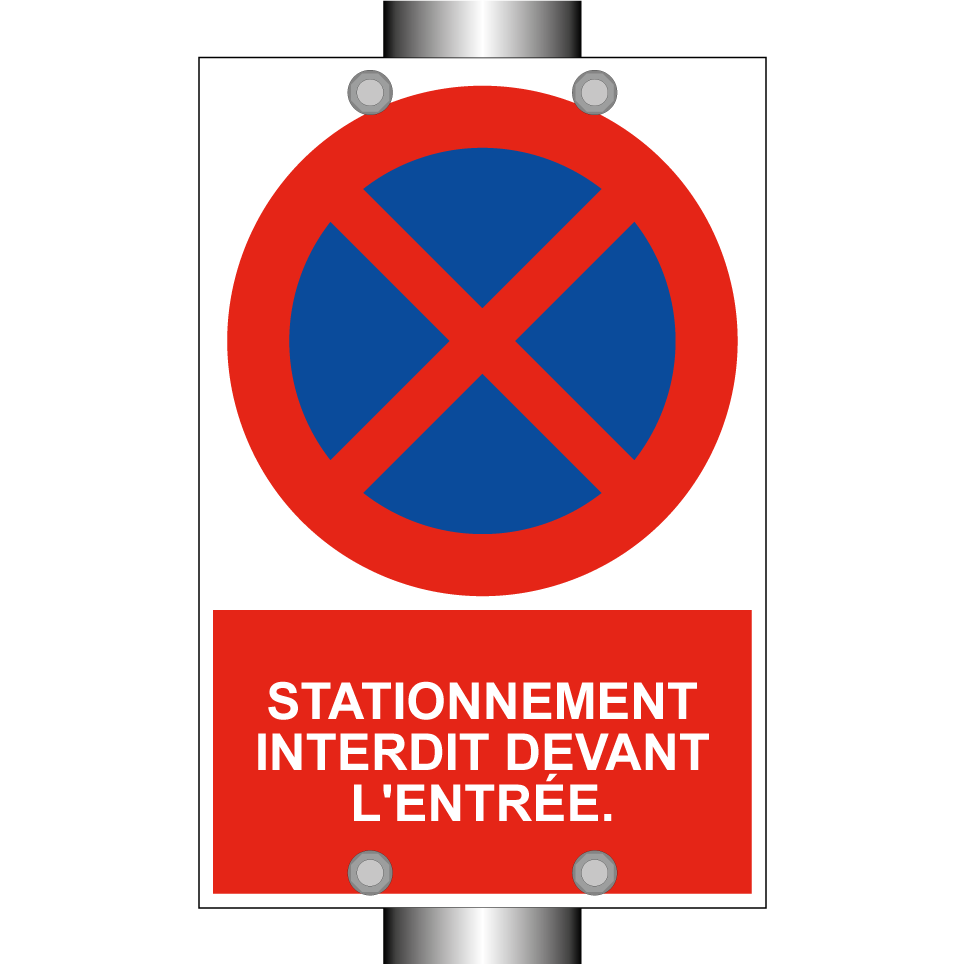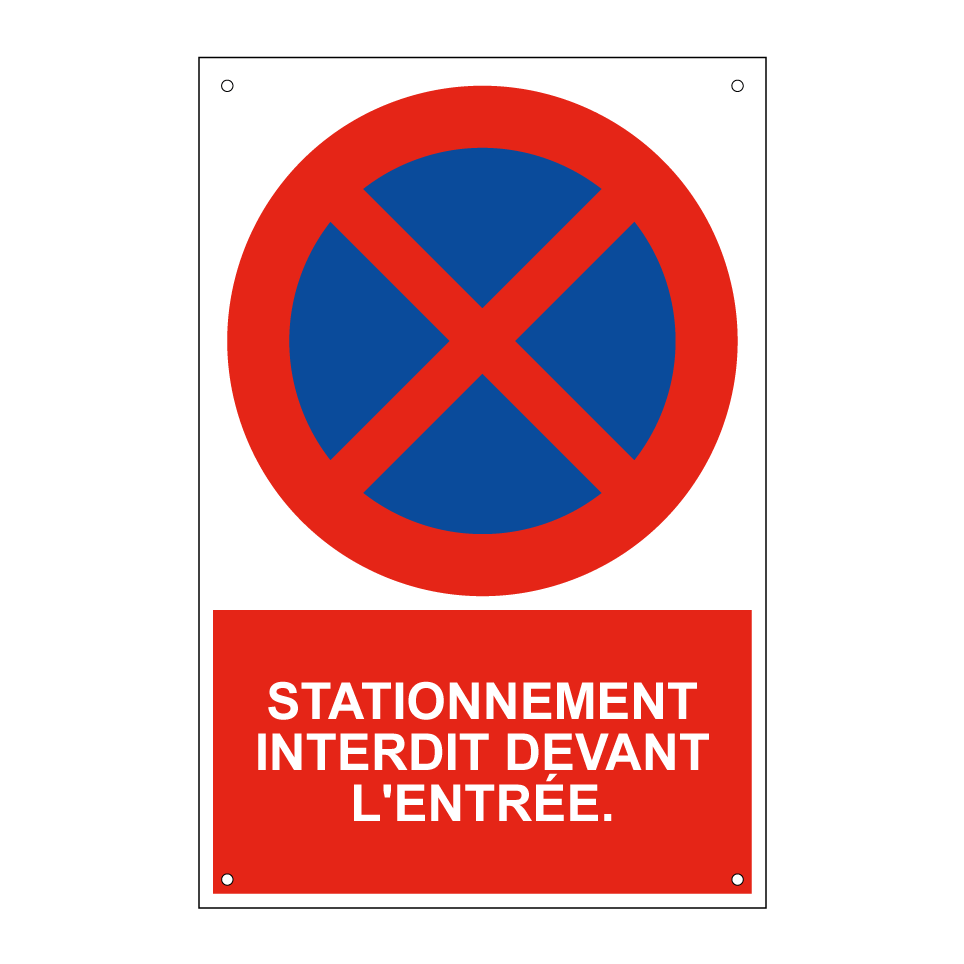 Panneau d'interdiction de stationner avec le texte : "Stationnement interdit devant l'entrée." et une symbolique claire.