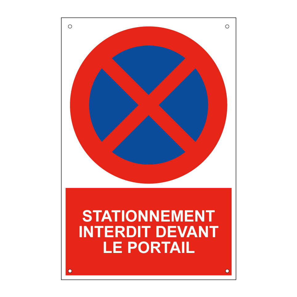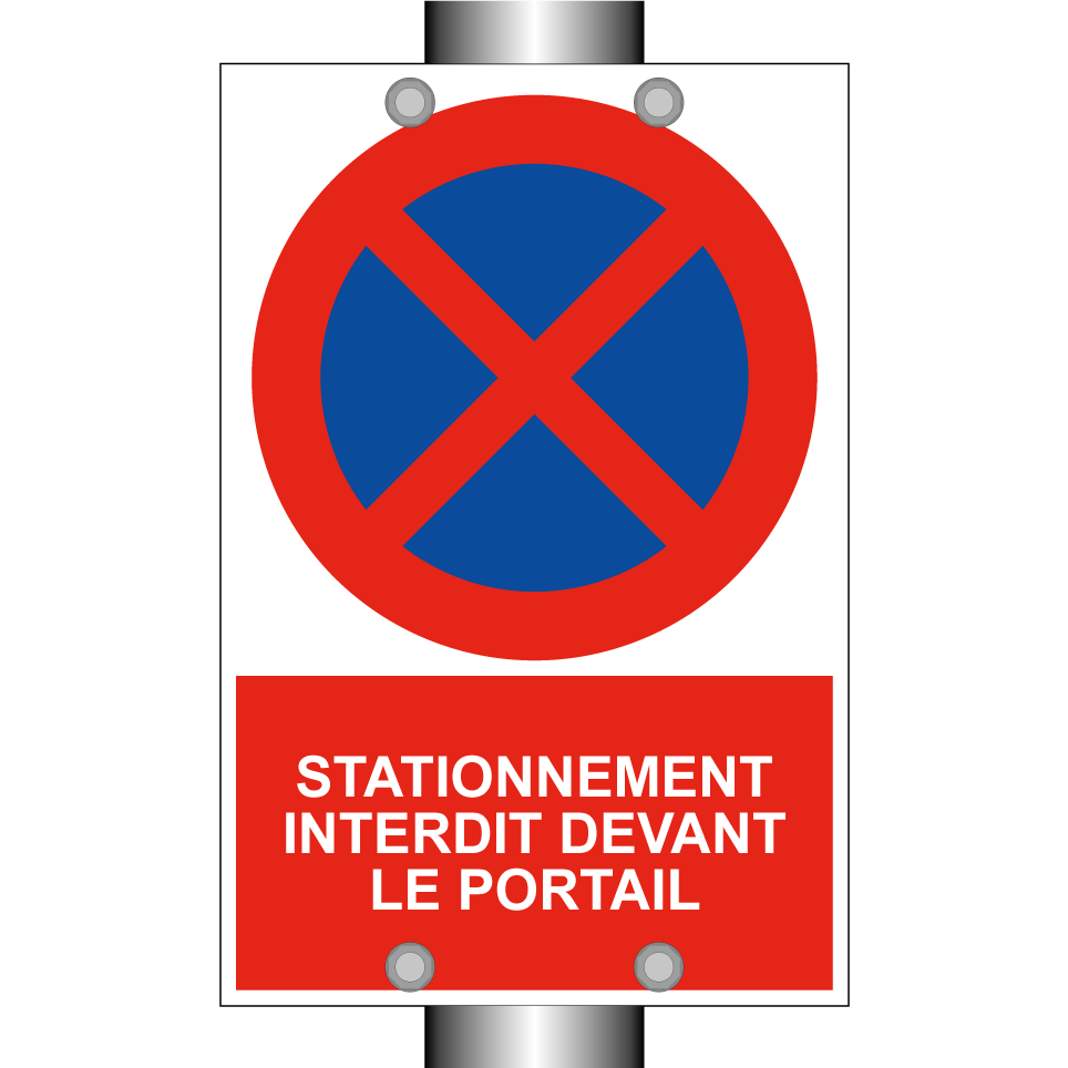 Panneau d'interdiction de stationner avec le texte : "Stationnement interdit devant le portail" et une symbolique claire.