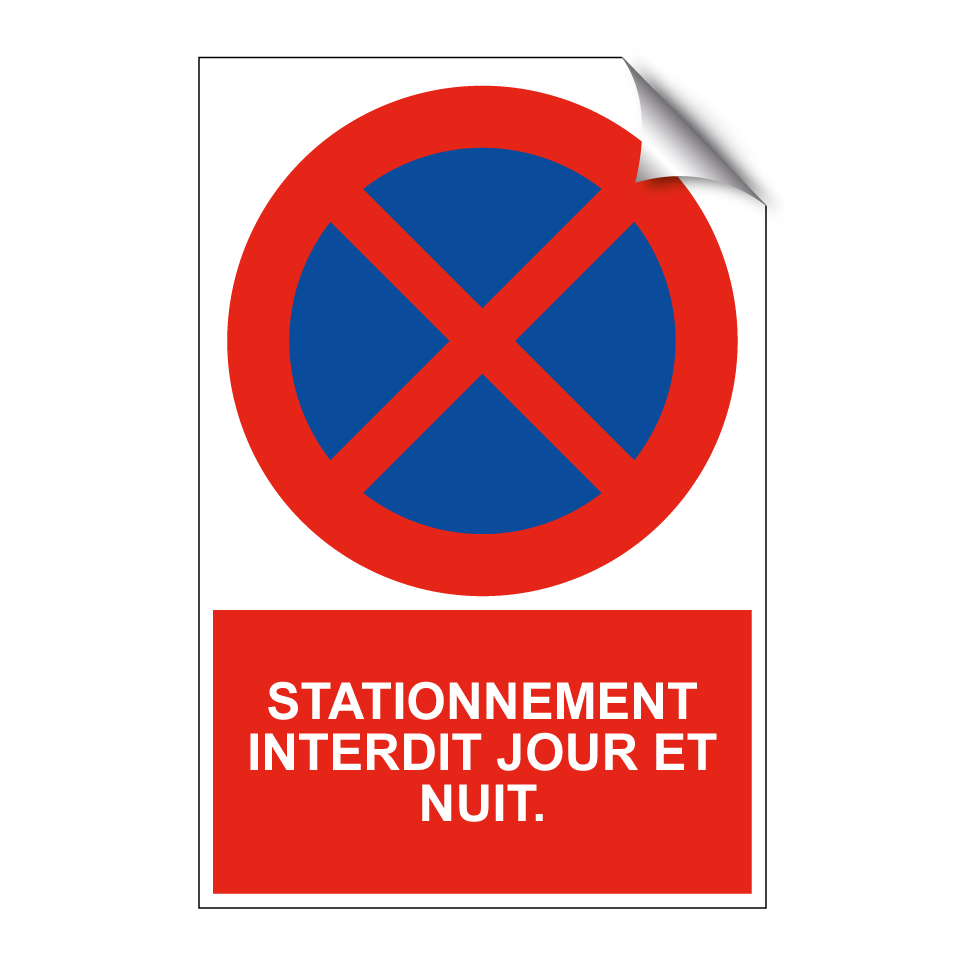 Panneau d'interdiction de stationner avec le texte : "Stationnement interdit jour et nuit." et une symbolique claire.