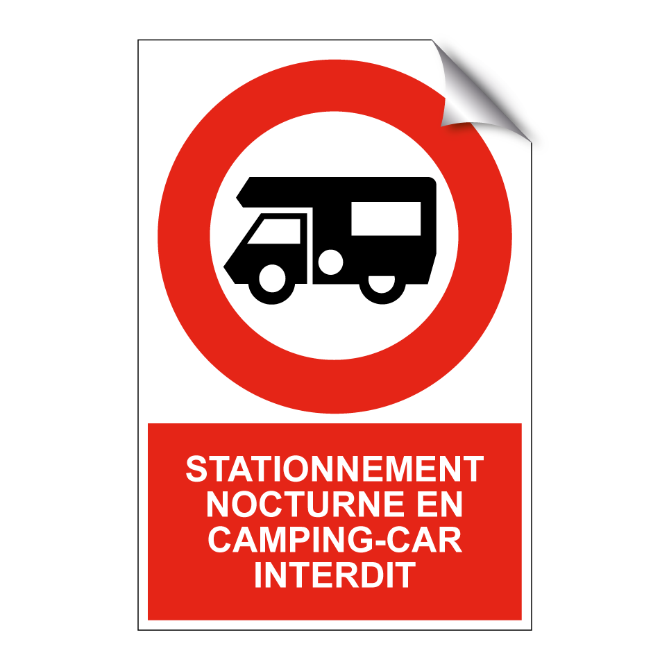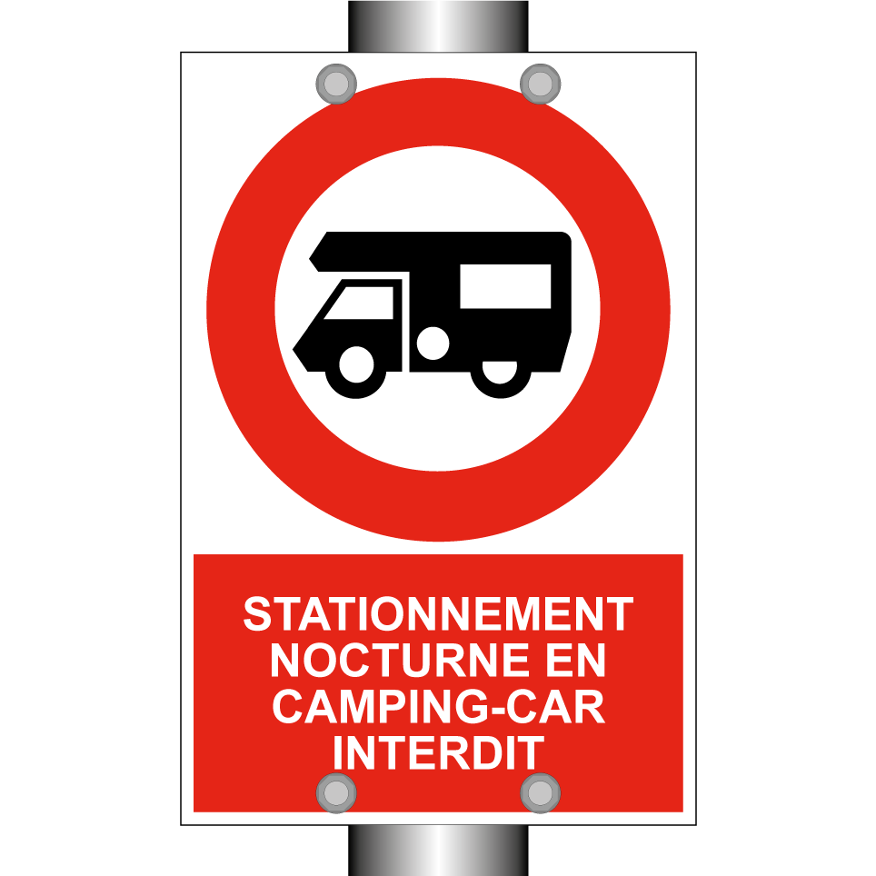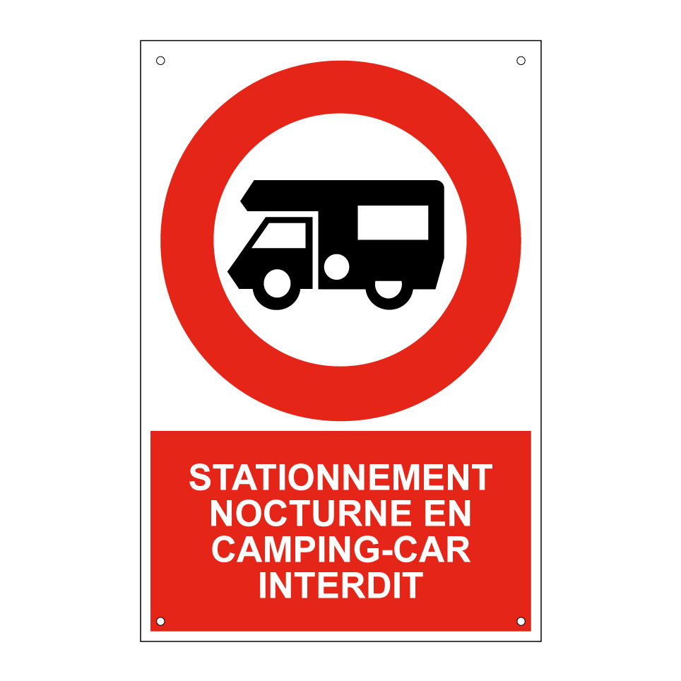 Panneau d'interdiction de stationner avec le texte : "Stationnement nocturne en camping-car interdit" et une symbolique claire.