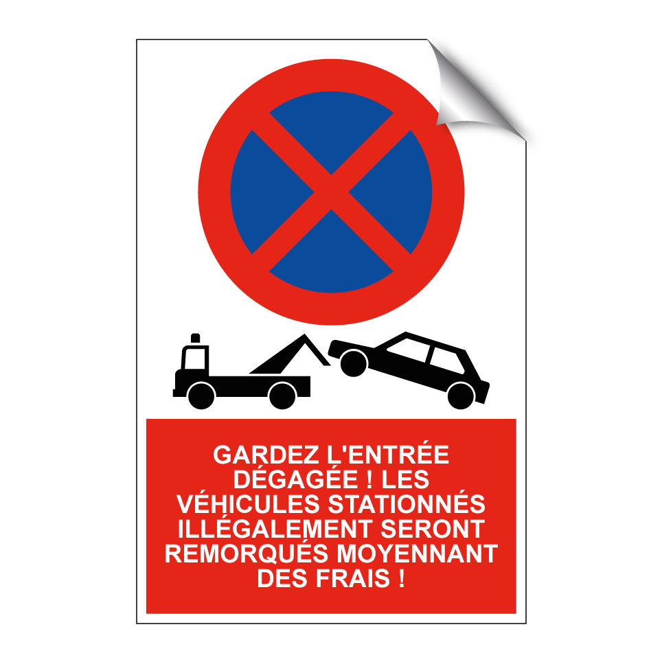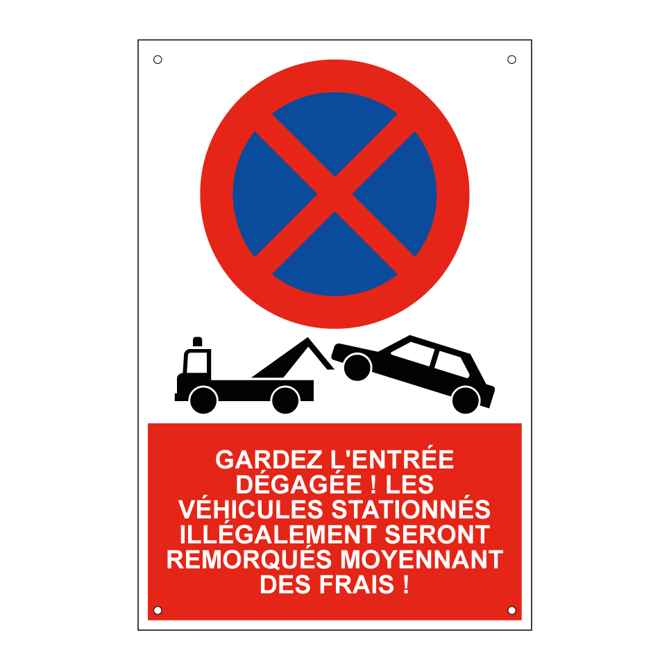 Panneau d'interdiction de stationner avec le texte : "Gardez l'entrée dégagée ! Les véhicules stationnés illégalement seront remorqués moyennant des frais !" et une symbolique claire.