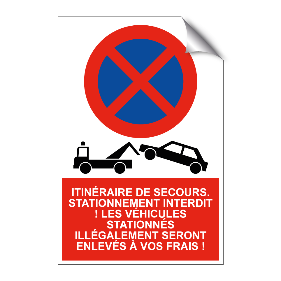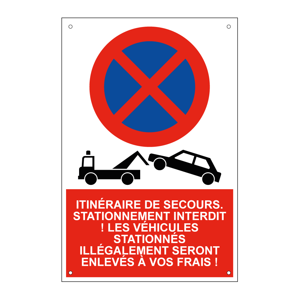 Panneau d'interdiction de stationner avec le texte : "Itinéraire de secours. Stationnement interdit ! Les véhicules stationnés illégalement seront enlevés à vos frais !" et une symbolique claire.