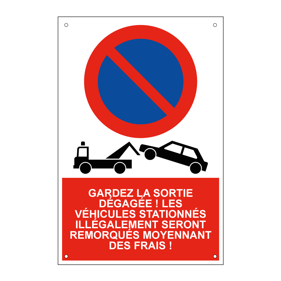Panneau d'interdiction de stationner avec le texte : "Gardez la sortie dégagée ! Les véhicules stationnés illégalement seront remorqués moyennant des frais !" et une symbolique claire.