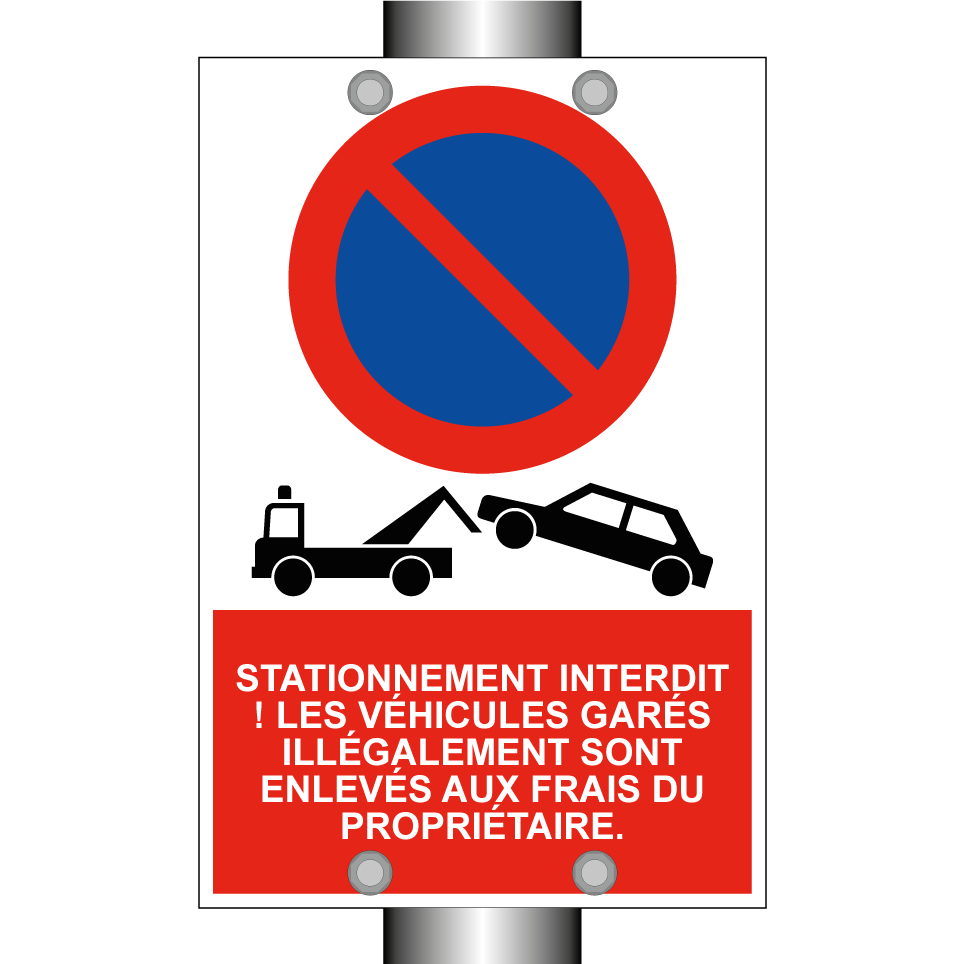Panneau d'interdiction de stationner avec le texte : "Stationnement interdit ! Les véhicules garés illégalement sont enlevés aux frais du propriétaire." et une symbolique claire.