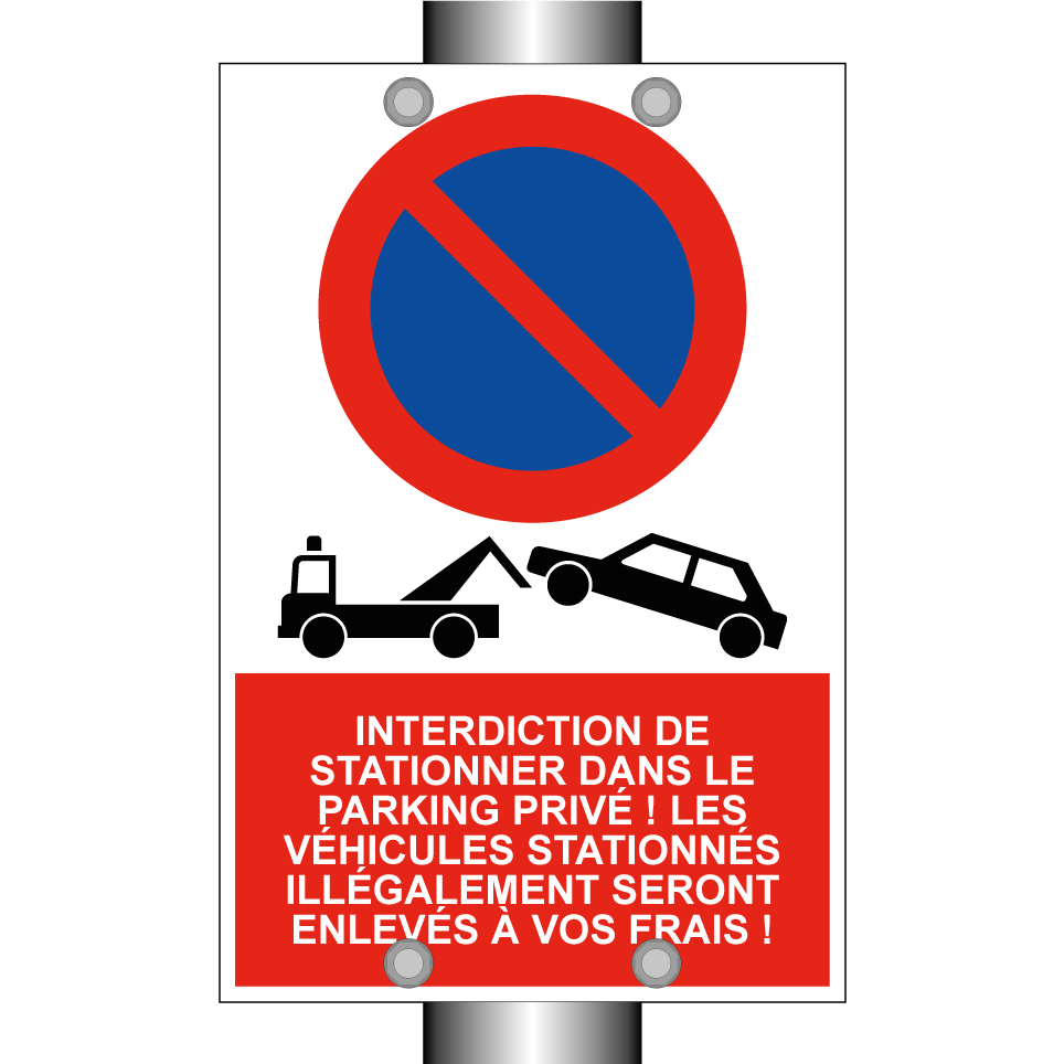 Panneau d'interdiction de stationner avec le texte : "Interdiction de stationner dans le parking privé ! Les véhicules stationnés illégalement seront enlevés à vos frais !" et une symbolique claire.