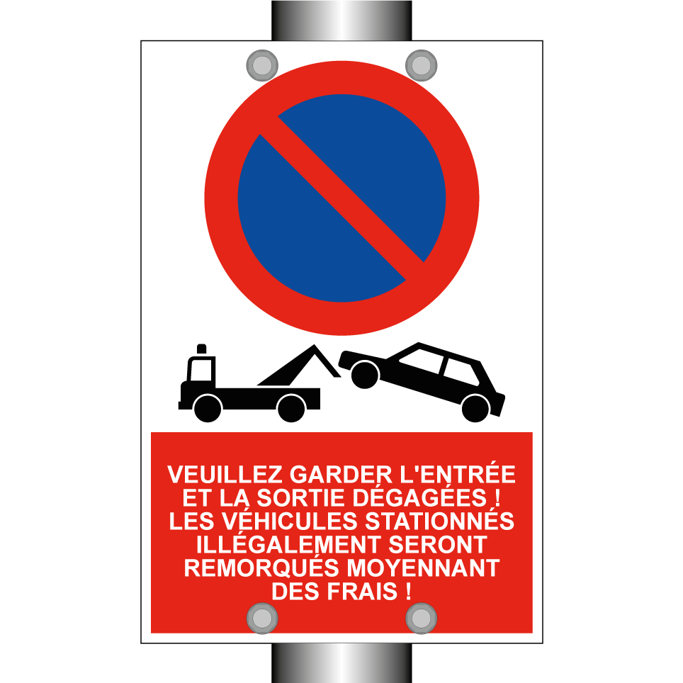 Panneau d'interdiction de stationner avec le texte : "Veuillez garder l'entrée et la sortie dégagées ! Les véhicules stationnés illégalement seront remorqués moyennant des frais !" et une symbolique claire.
