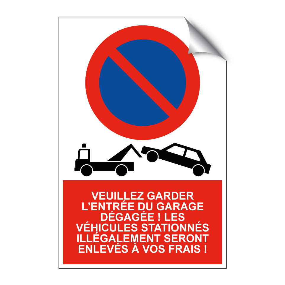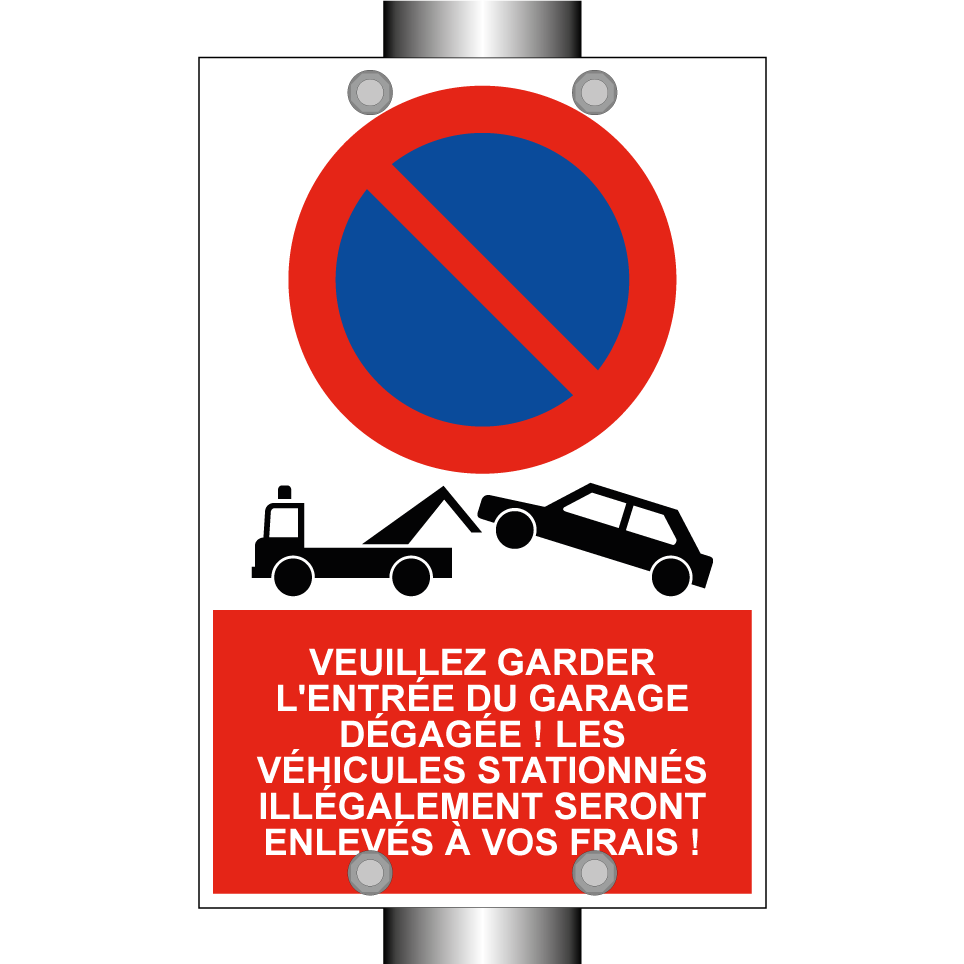 Panneau d'interdiction de stationner avec le texte : "Veuillez garder l'entrée du garage dégagée ! Les véhicules stationnés illégalement seront enlevés à vos frais !" et une symbolique claire.