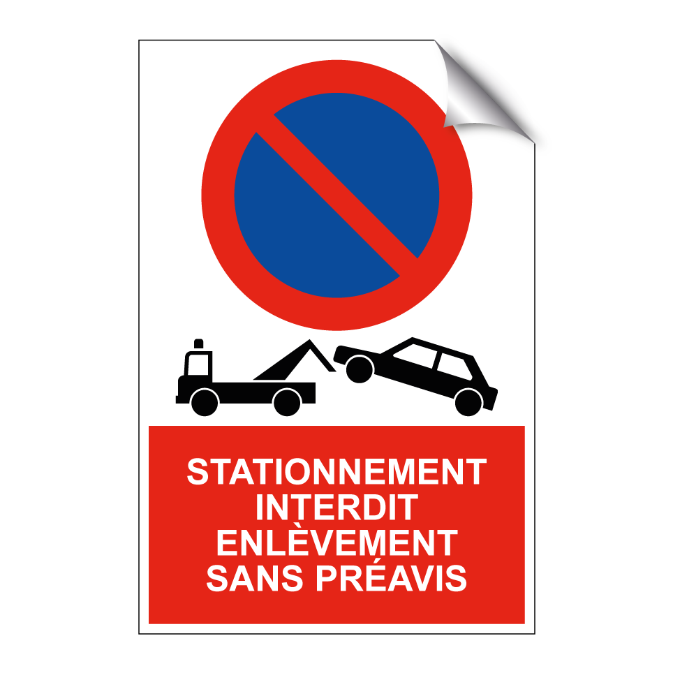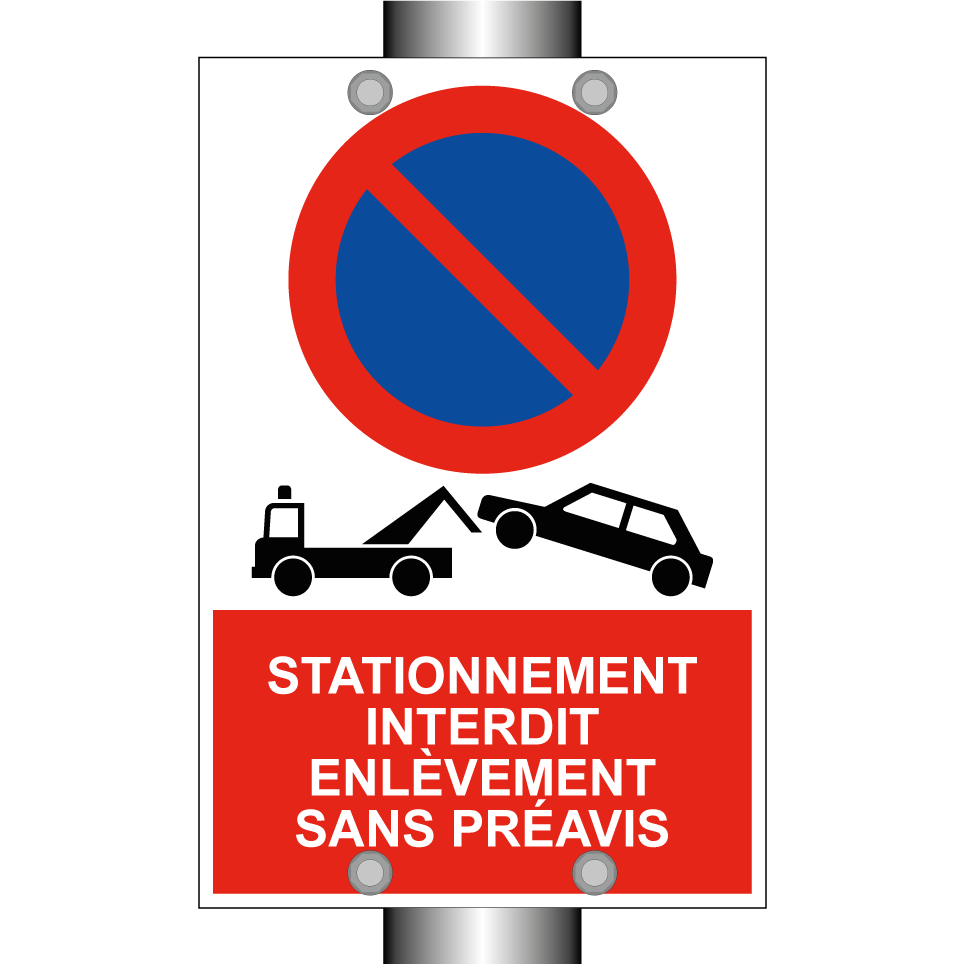 Panneau d'interdiction de stationner avec le texte : "Stationnement interdit enlèvement sans préavis" et une symbolique claire.
