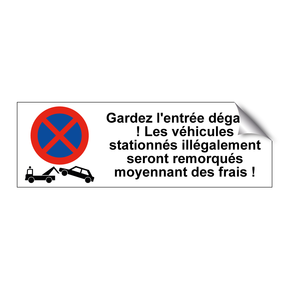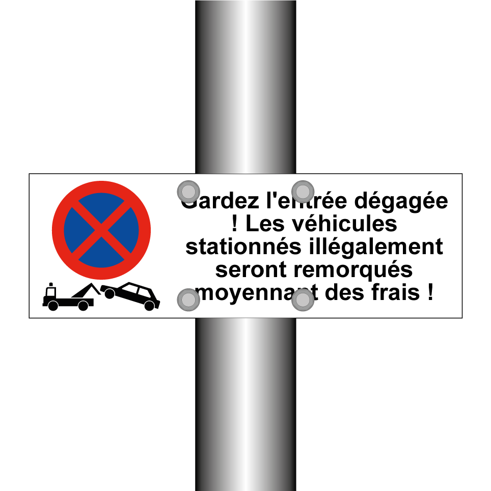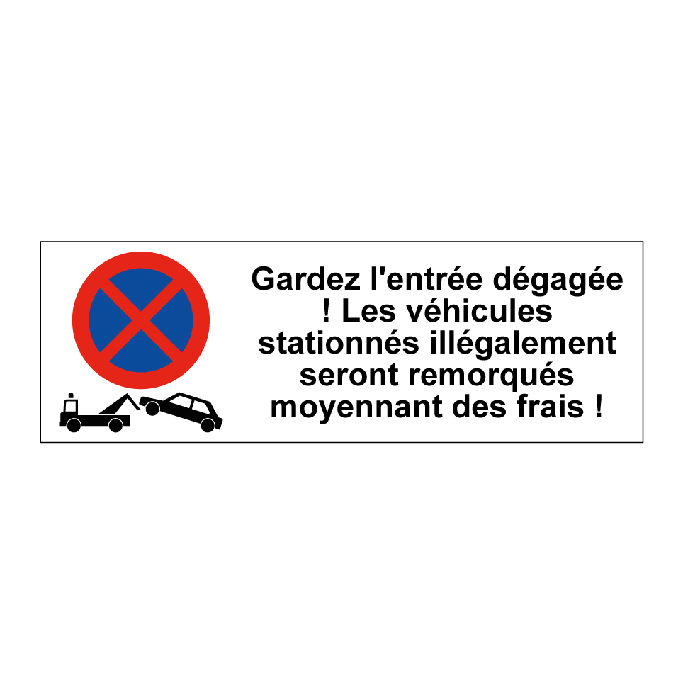 Panneau d'interdiction de stationner avec le texte : "Gardez l'entrée dégagée ! Les véhicules stationnés illégalement seront remorqués moyennant des frais !" et une symbolique claire.