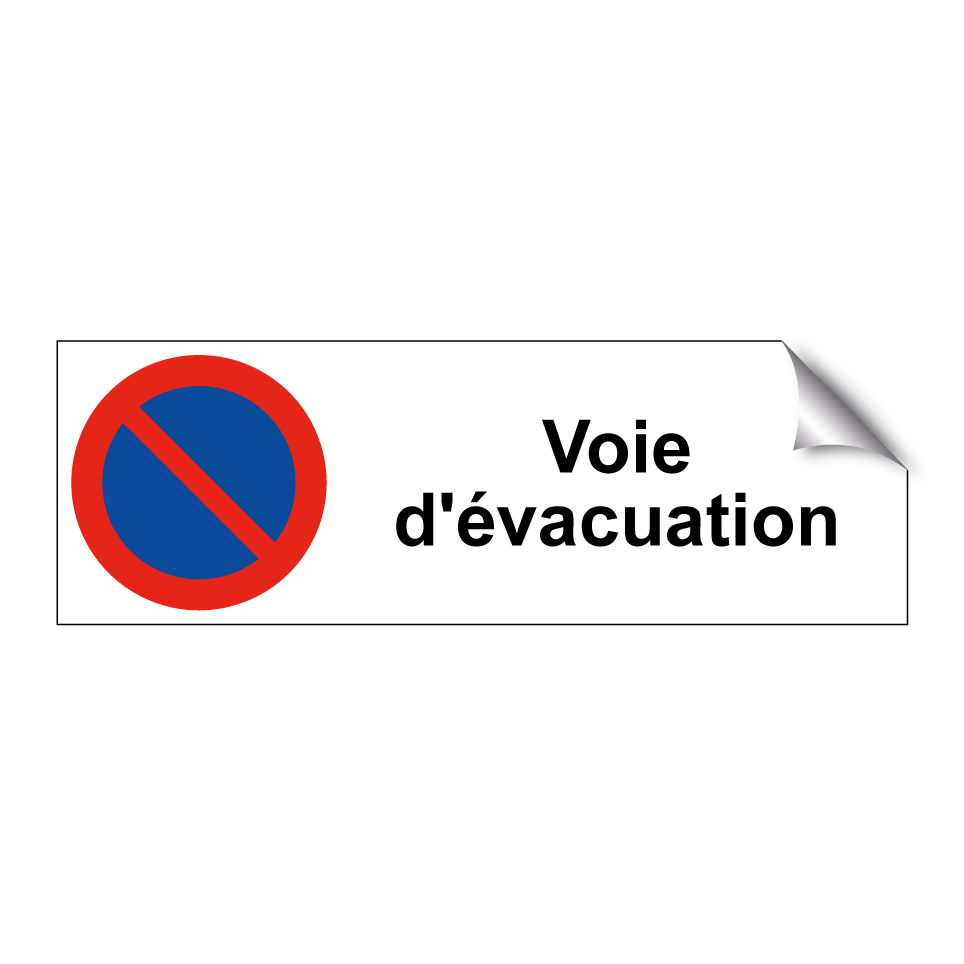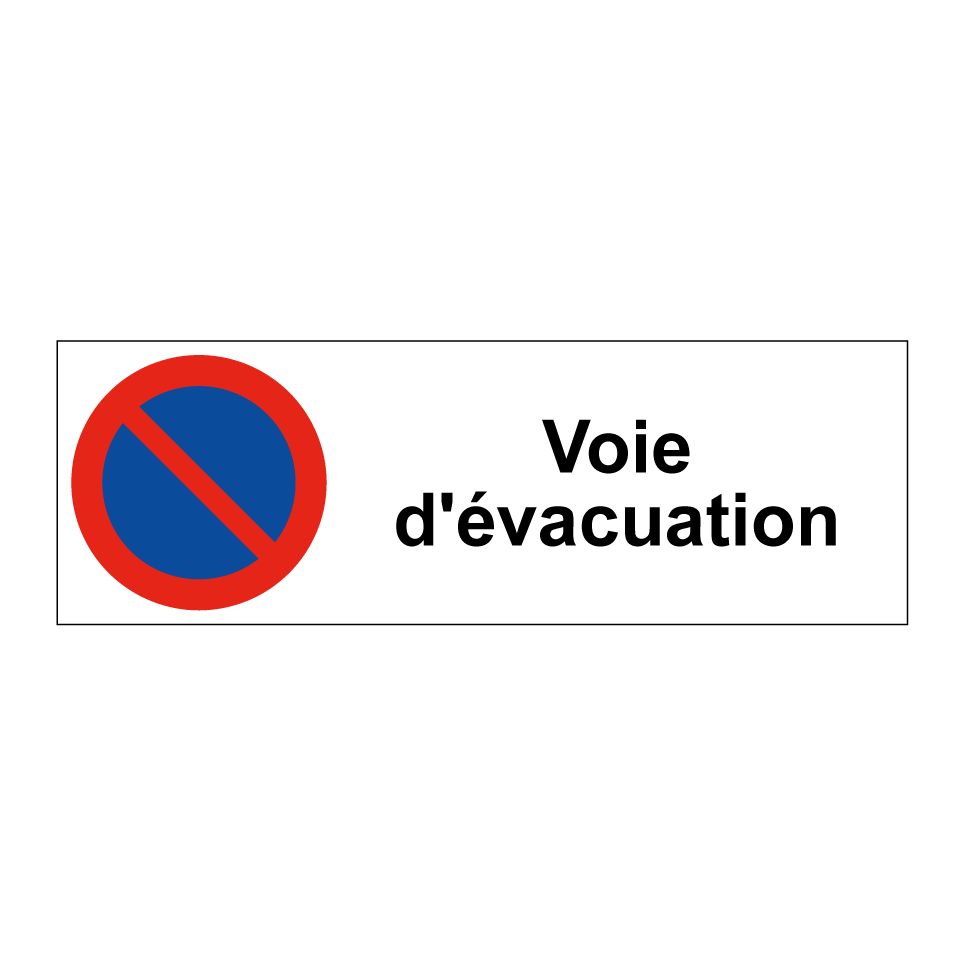 Panneau d'interdiction de stationner avec le texte : "Voie d'évacuation" et une symbolique claire.