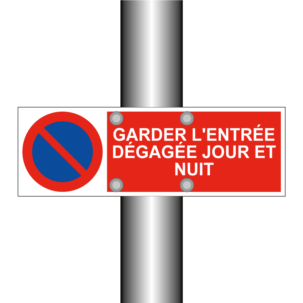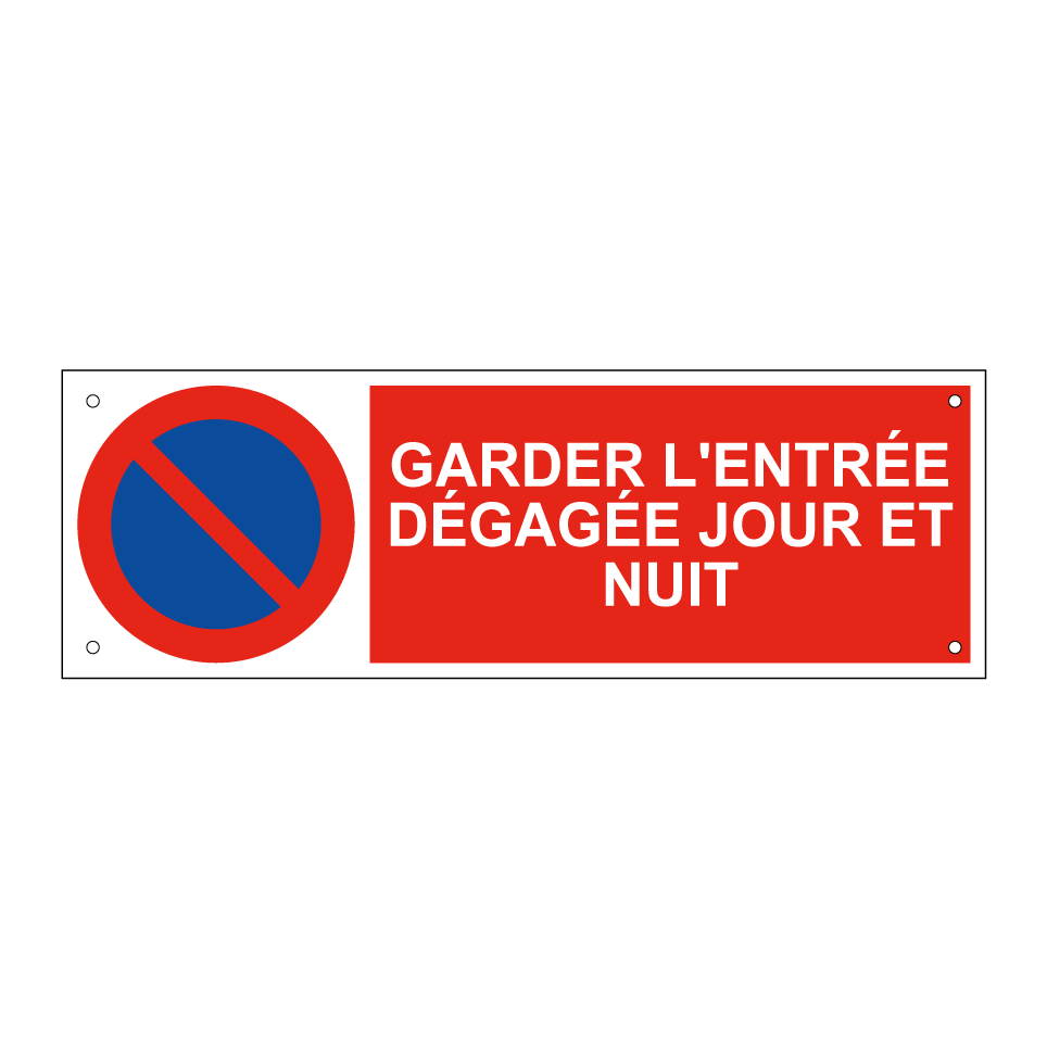 Panneau d'interdiction de stationner avec le texte : "Garder l'entrée dégagée jour et nuit" et une symbolique claire.