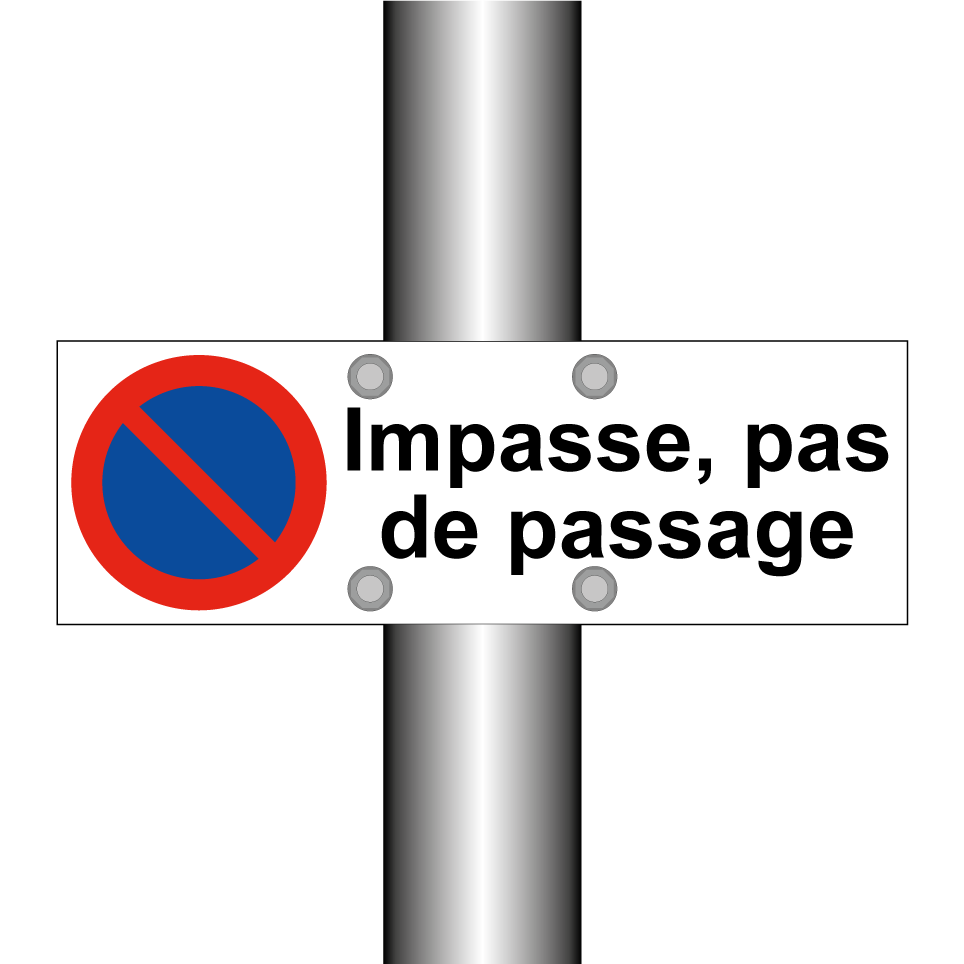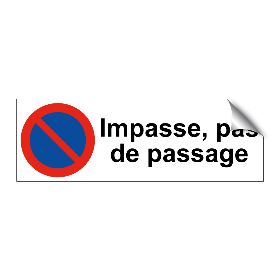 Panneau d'interdiction de stationner avec le texte : "Impasse, pas de passage" et une symbolique claire.