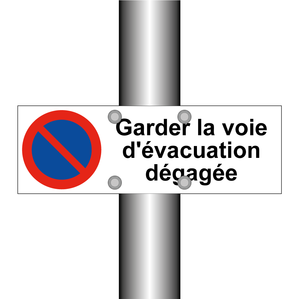 Panneau d'interdiction de stationner avec le texte : "Garder la voie d'évacuation dégagée" et une symbolique claire.