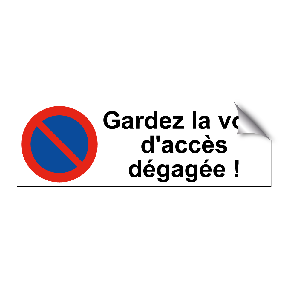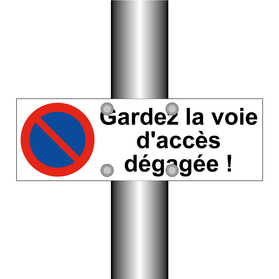 Panneau d'interdiction de stationner avec le texte : "Gardez la voie d'accès dégagée !" et une symbolique claire.
