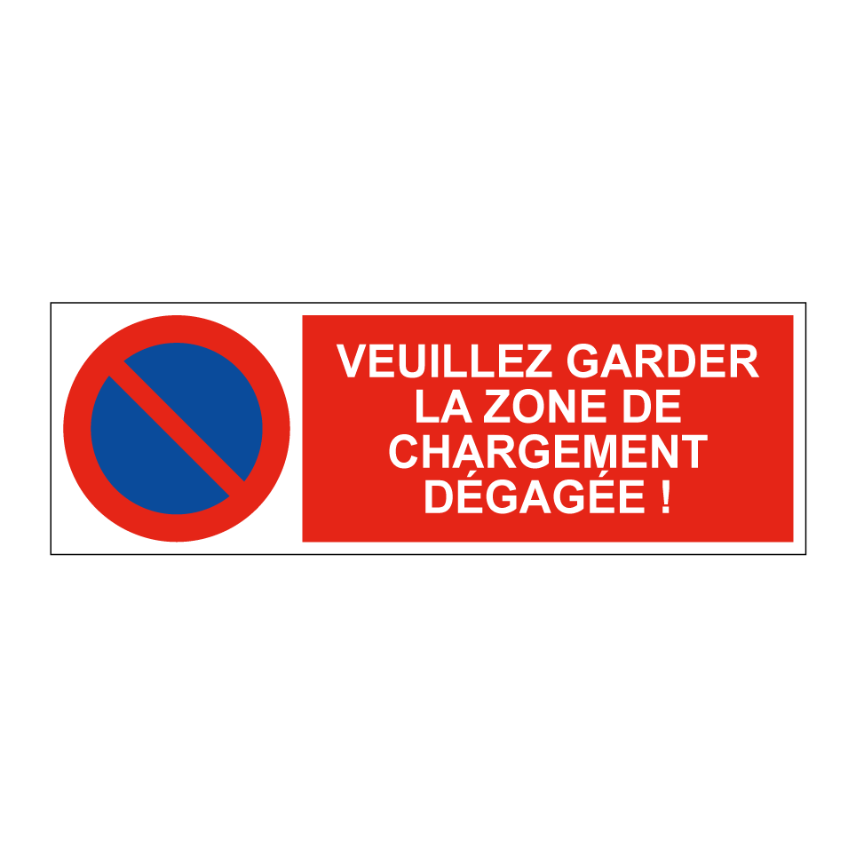 Panneau d'interdiction de stationner avec le texte : "Veuillez garder la zone de chargement dégagée !" et une symbolique claire.