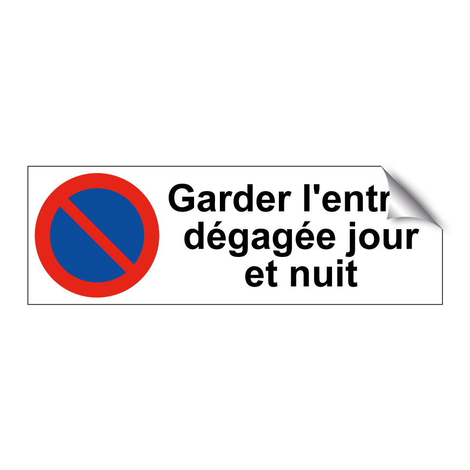 Panneau d'interdiction de stationner avec le texte : "Garder l'entrée dégagée jour et nuit" et une symbolique claire.