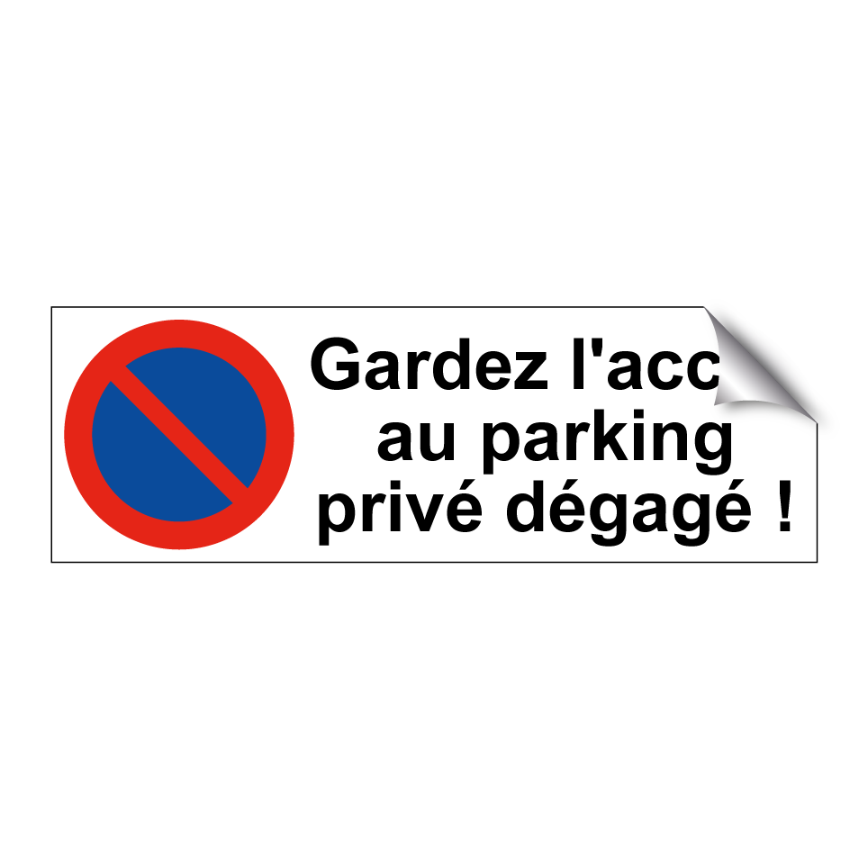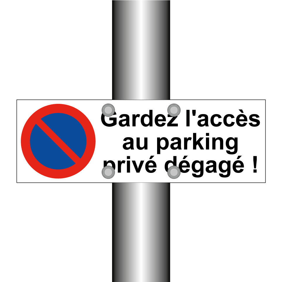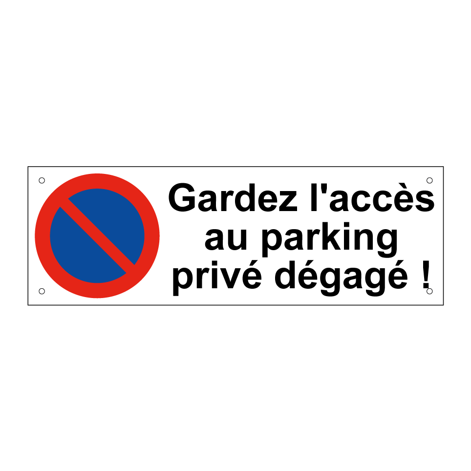 Panneau d'interdiction de stationner avec le texte : "Gardez l'accès au parking privé dégagé !" et une symbolique claire.
