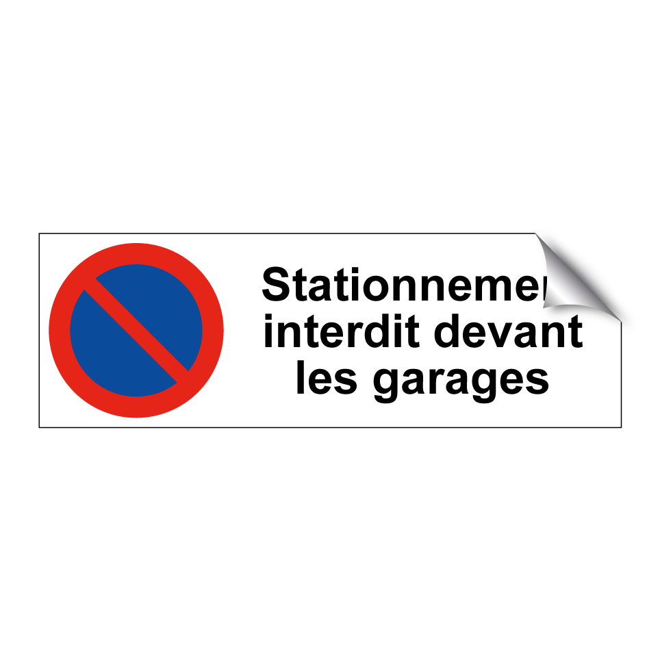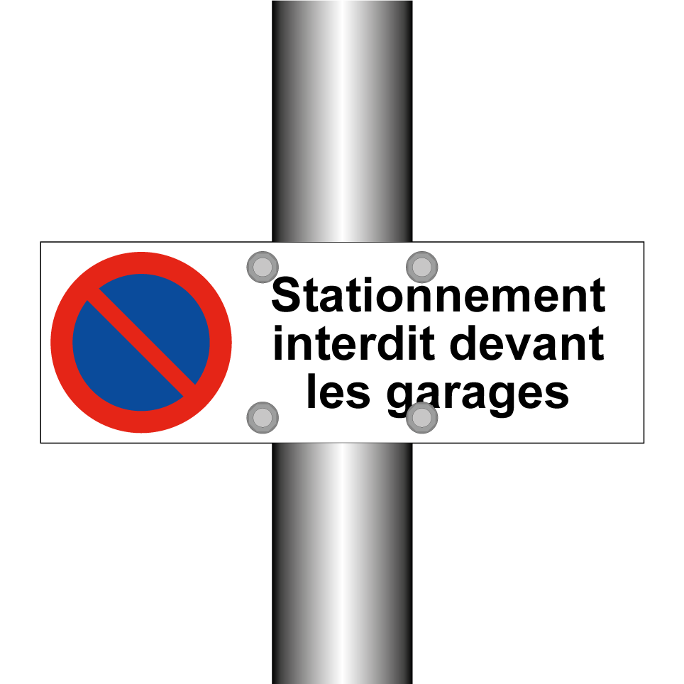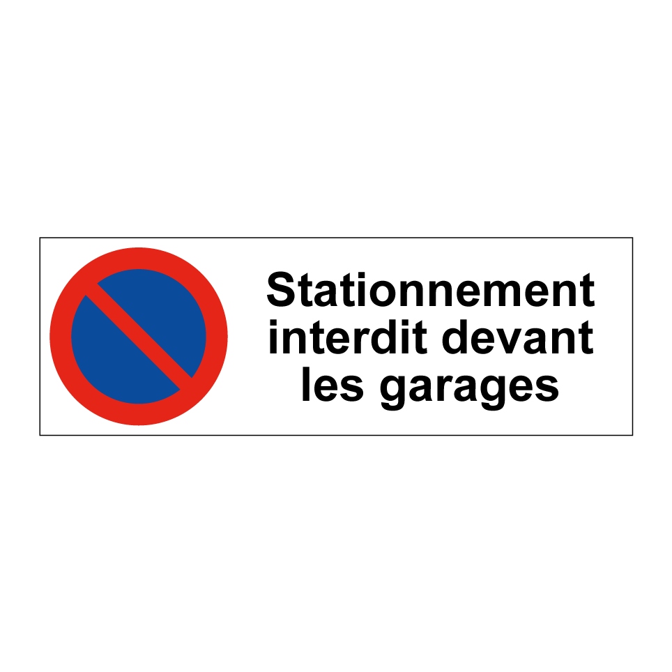 Panneau d'interdiction de stationner avec le texte : "Stationnement interdit devant les garages" et une symbolique claire.