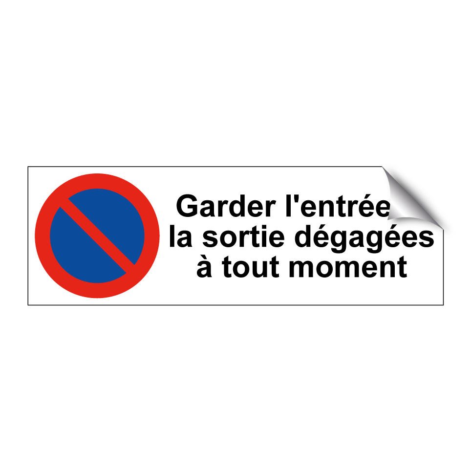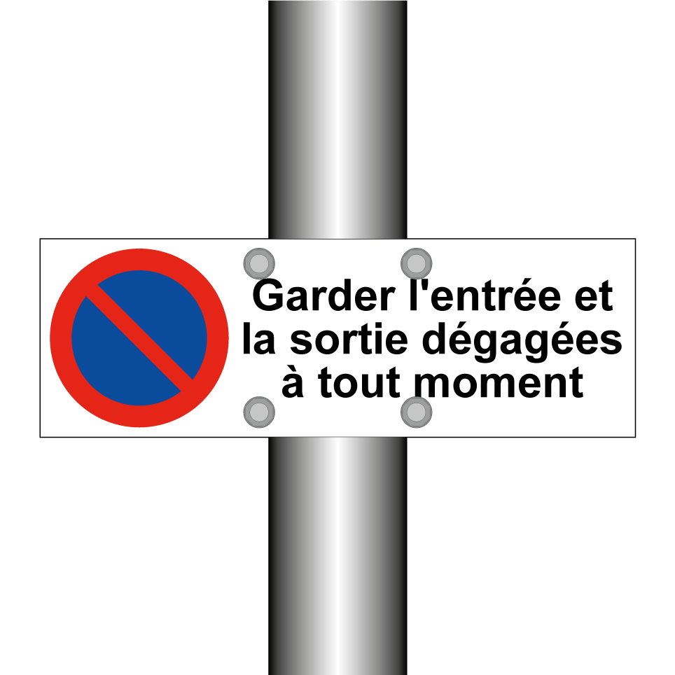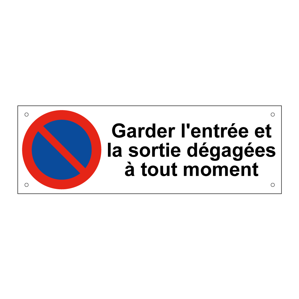 Panneau d'interdiction de stationner avec le texte : "Garder l'entrée et la sortie dégagées à tout moment" et une symbolique claire.