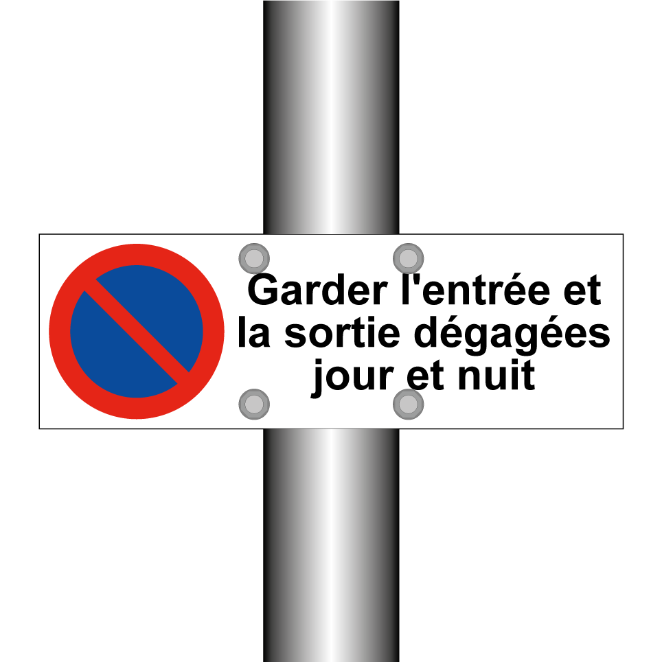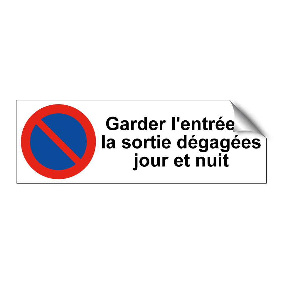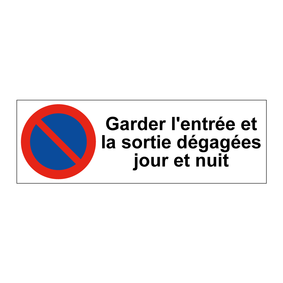 Panneau d'interdiction de stationner avec le texte : "Garder l'entrée et la sortie dégagées jour et nuit" et une symbolique claire.