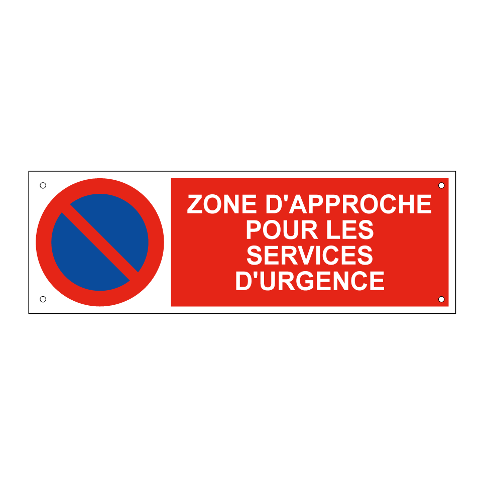 Panneau d'interdiction de stationner avec le texte : "Zone d'approche pour les services d'urgence" et une symbolique claire.