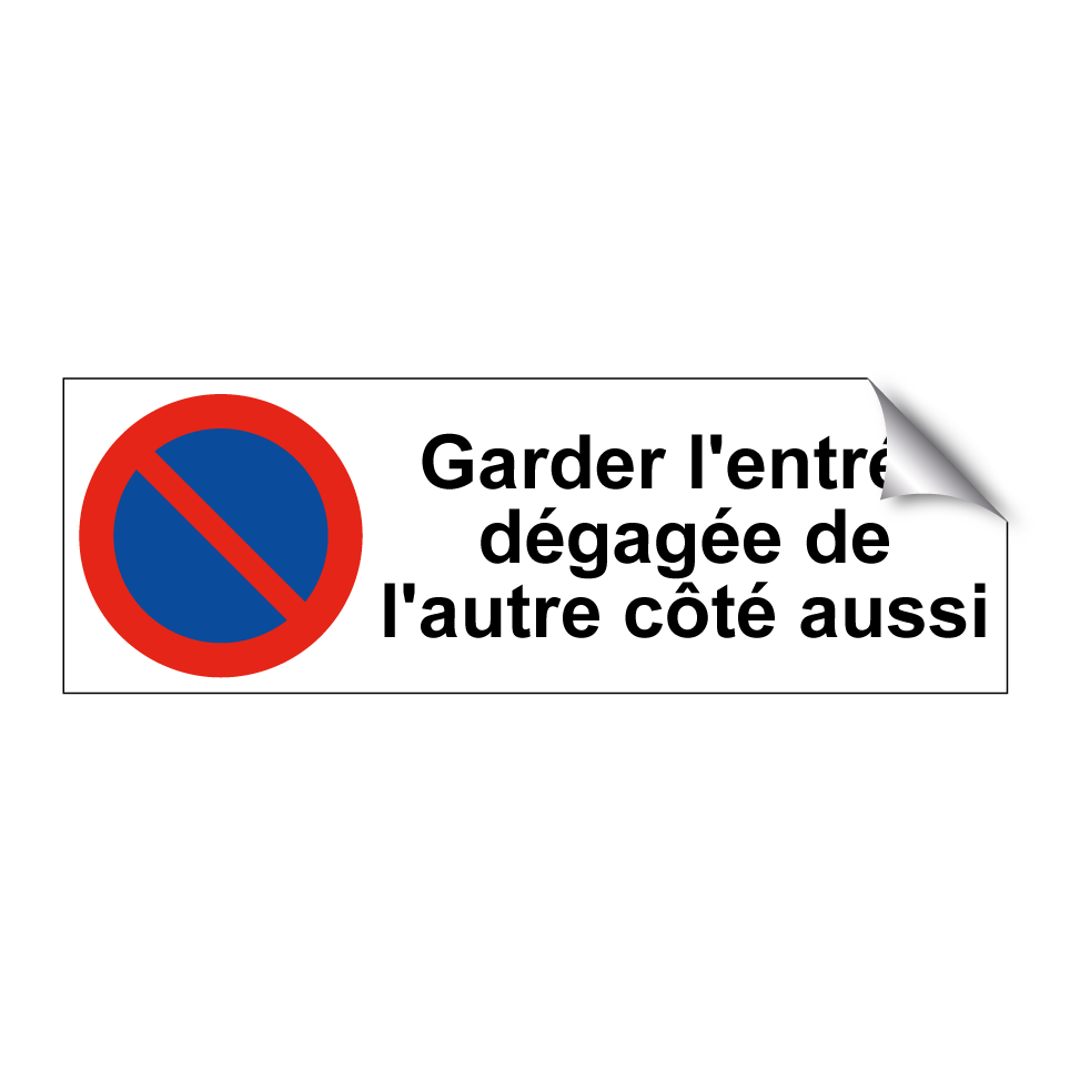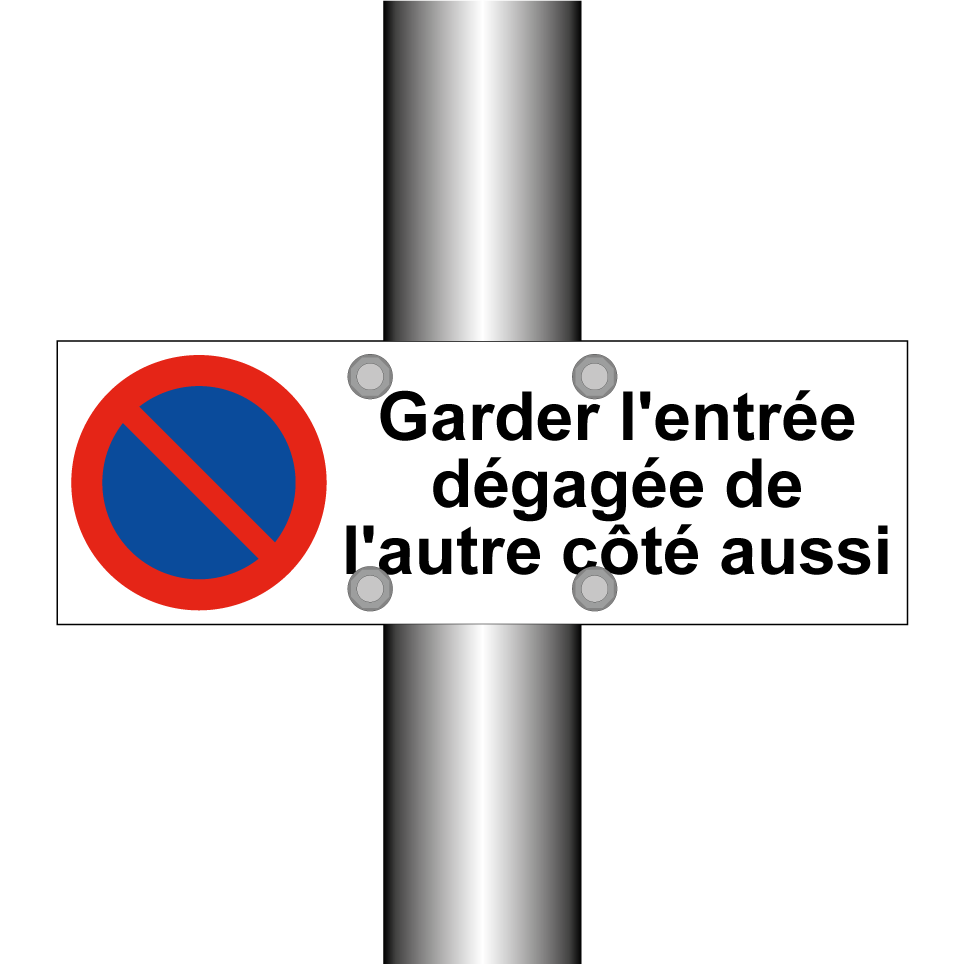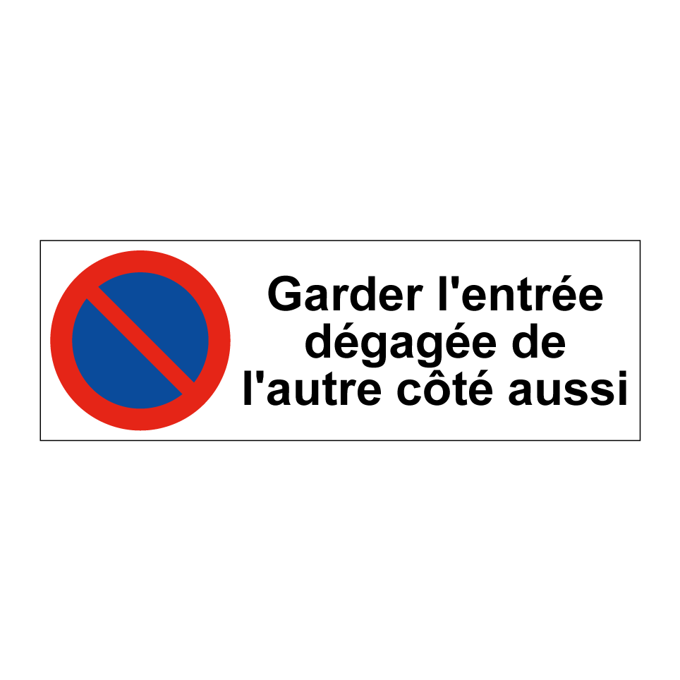 Panneau d'interdiction de stationner avec le texte : "Garder l'entrée dégagée de l'autre côté aussi" et une symbolique claire.