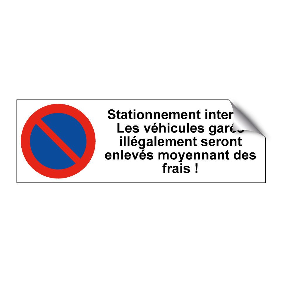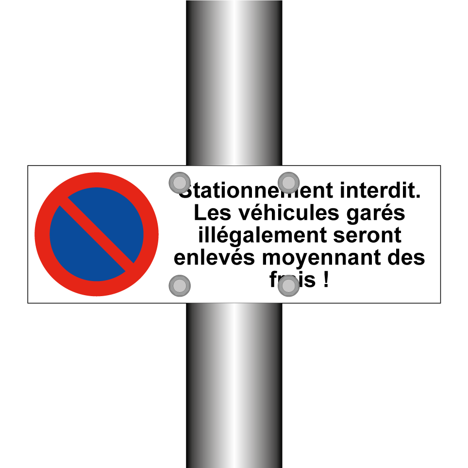 Panneau d'interdiction de stationner avec le texte : "Stationnement interdit. Les véhicules garés illégalement seront enlevés moyennant des frais !" et une symbolique claire.