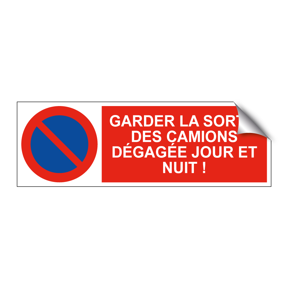 Panneau d'interdiction de stationner avec le texte : "Garder la sortie des camions dégagée jour et nuit !" et une symbolique claire.