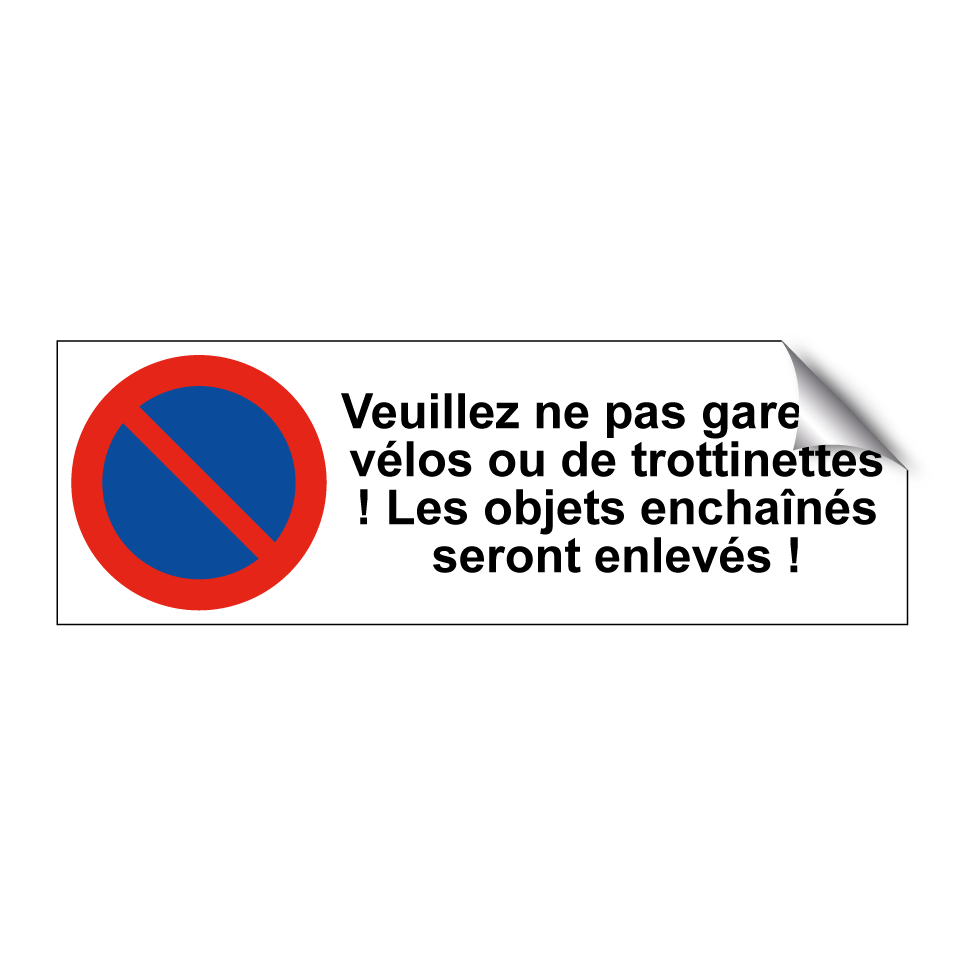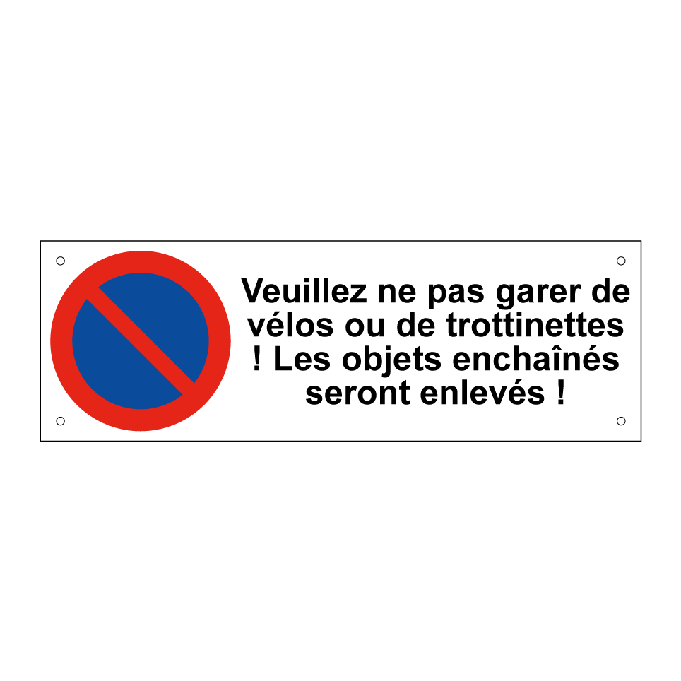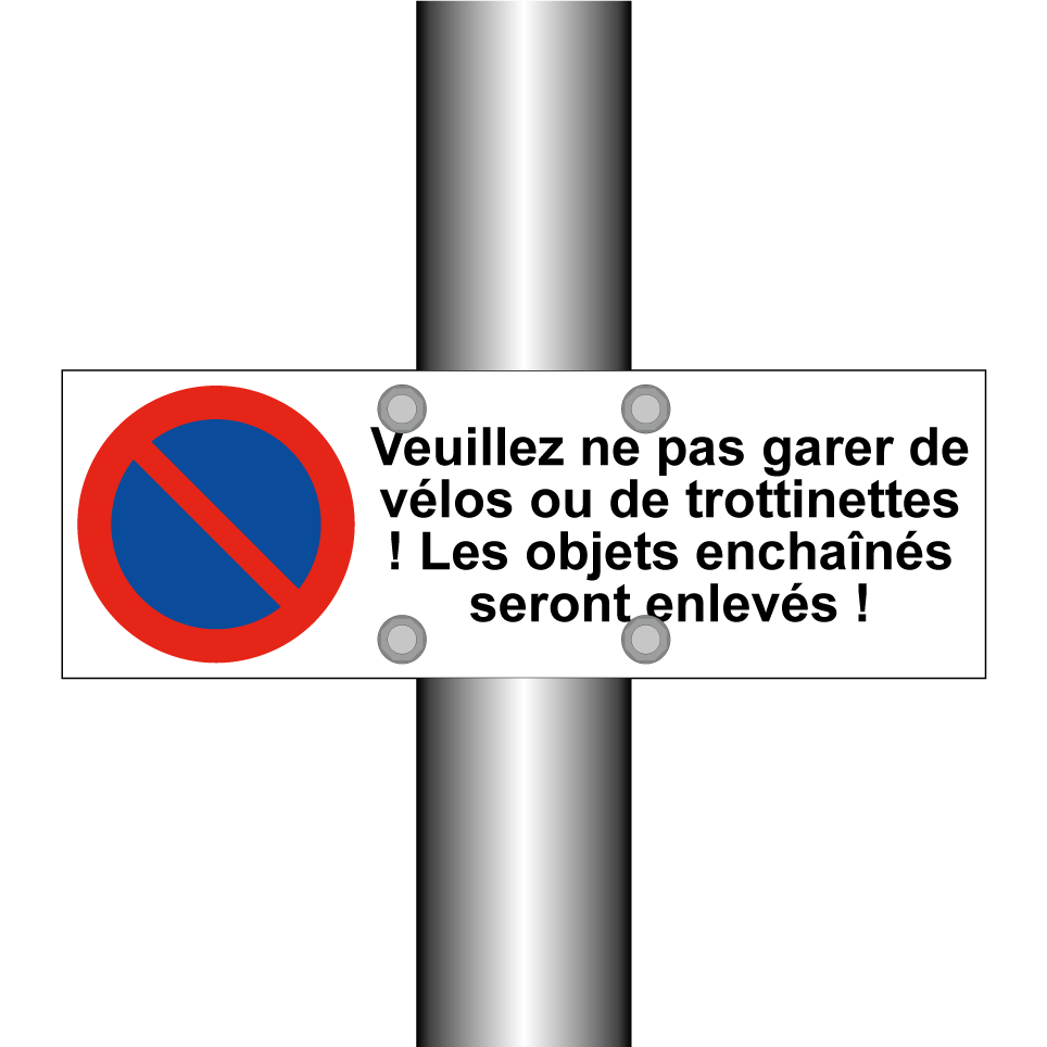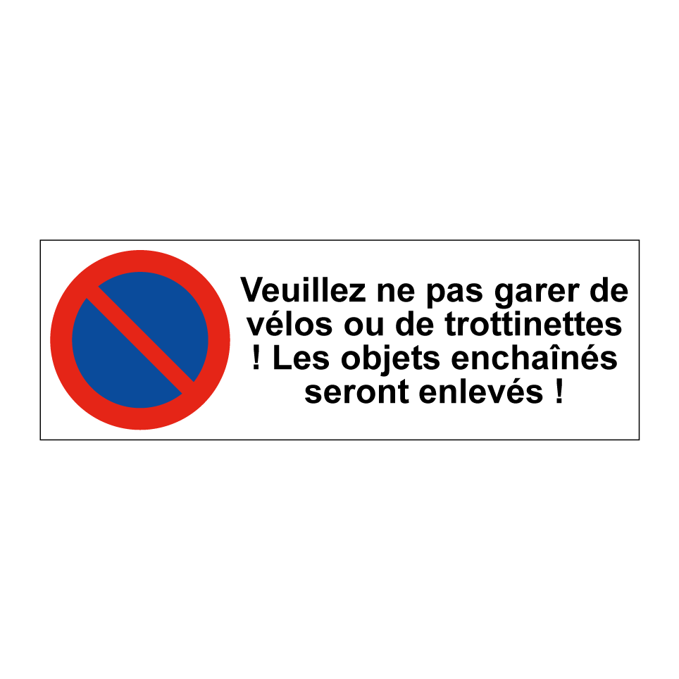 Panneau d'interdiction de stationner avec le texte : "Veuillez ne pas garer de vélos ou de trottinettes ! Les objets enchaînés seront enlevés !" et une symbolique claire.
