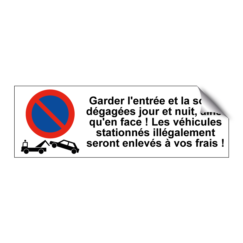 Panneau d'interdiction de stationner avec le texte : "Garder l'entrée et la sortie dégagées jour et nuit, ainsi qu'en face ! Les véhicules stationnés illégalement seront enlevés à vos frais !" et une symbolique claire.