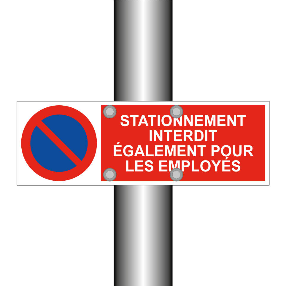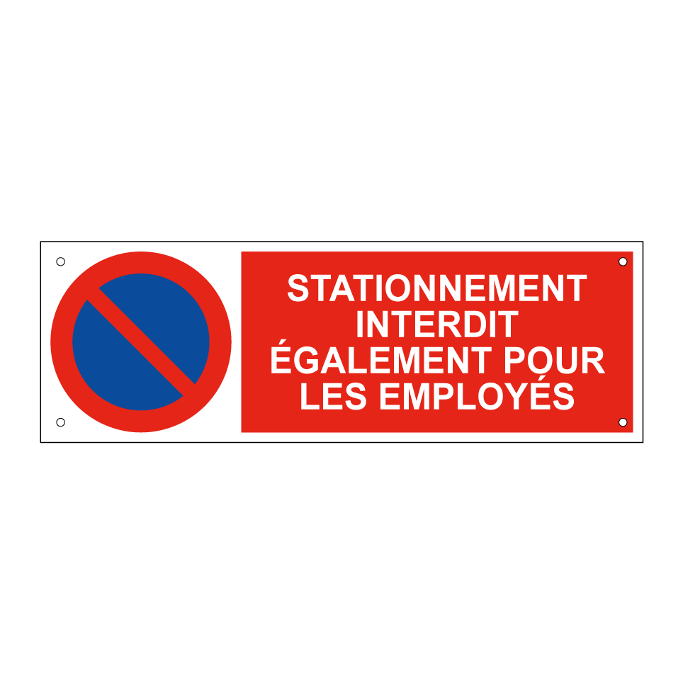 Panneau d'interdiction de stationner avec le texte : "Stationnement interdit également pour les employés" et une symbolique claire.