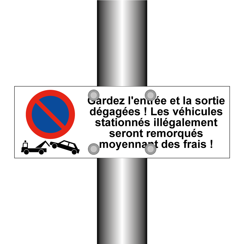 Panneau d'interdiction de stationner avec le texte : "Gardez l'entrée et la sortie dégagées ! Les véhicules stationnés illégalement seront remorqués moyennant des frais !" et une symbolique claire.
