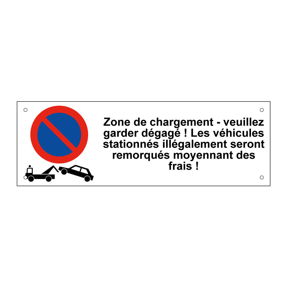 Panneau d'interdiction de stationner avec le texte : "Zone de chargement - veuillez garder dégagé ! Les véhicules stationnés illégalement seront remorqués moyennant des frais !" et une symbolique claire.